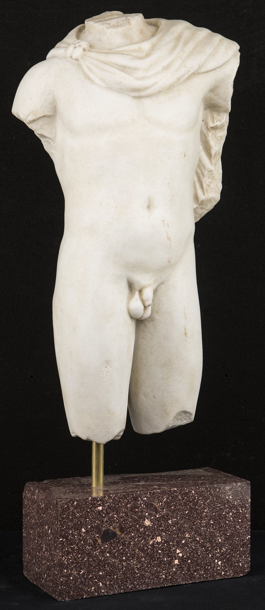 Torso virile in marmo statuario, , cm 73x26x13, su base rettangolare in porfido