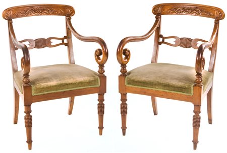 Coppia di poltrone in noce, XIX secolo, , cm 90x56x58, con schienali a giorno delimitati da spalliera intagliata a volute, sedile imbottito, braccioli sagomati terminanti a ricciolo, gambe rastremate con estremità tornite