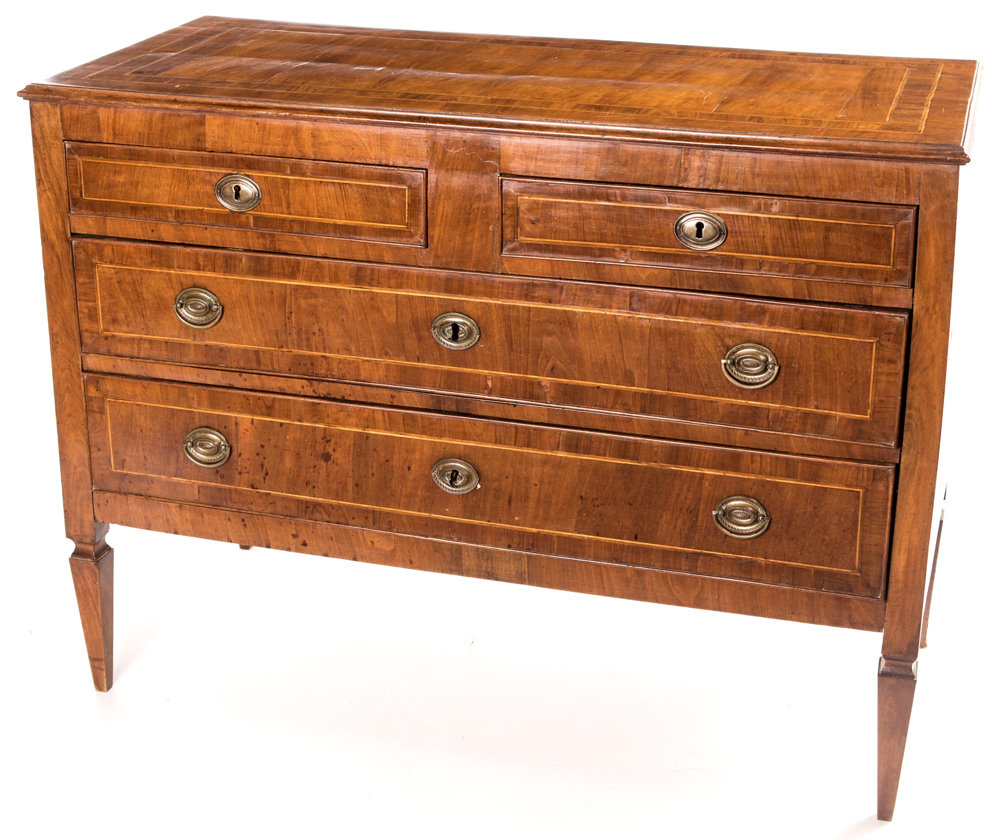 Cassettone Luigi XVI in ciliegio, fine XVIII/inizi XIX secolo, cm 89x117x53, con filettature in legno di frutto poste a cornice delle varie partizioni; piano rettangolare, due cassetti in linea nella fascia e due sottostanti con maniglie, piedi rastremati