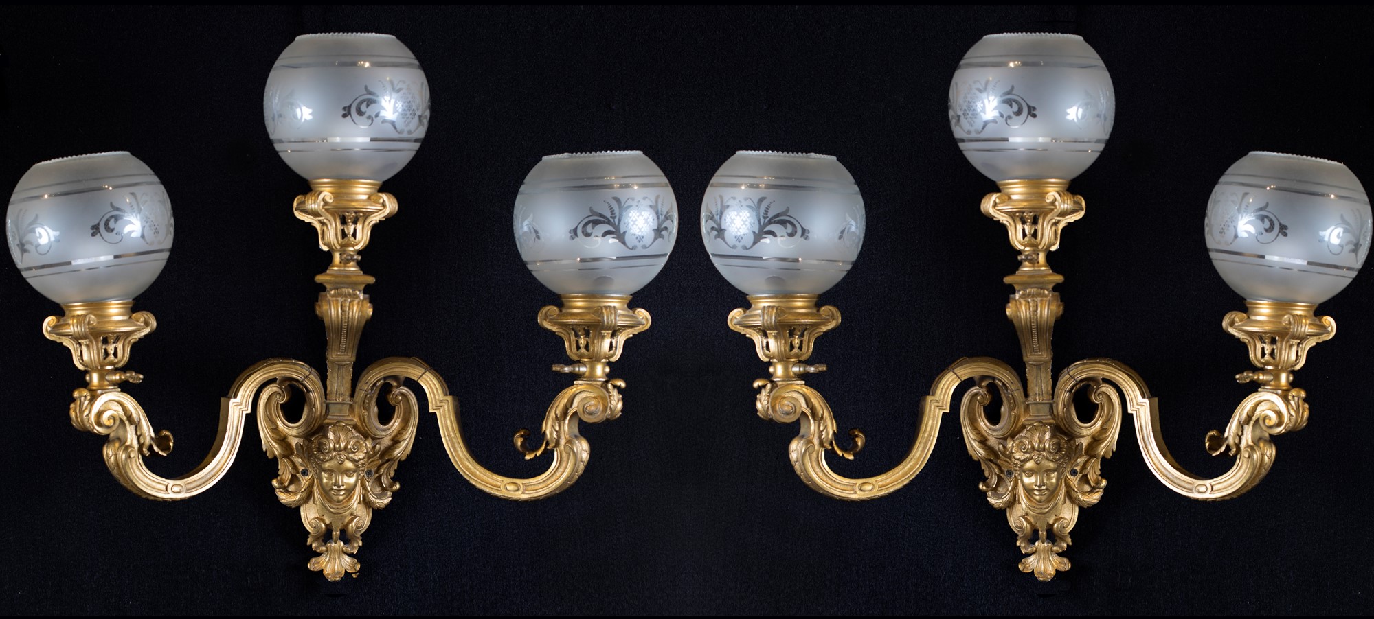 Coppia di appliques in bronzo dorato a tre luci, Francia, XIX secolo, , cm 50x62x22, con bracci sagomati emergenti da un mascherone e globi paraluce in vetro