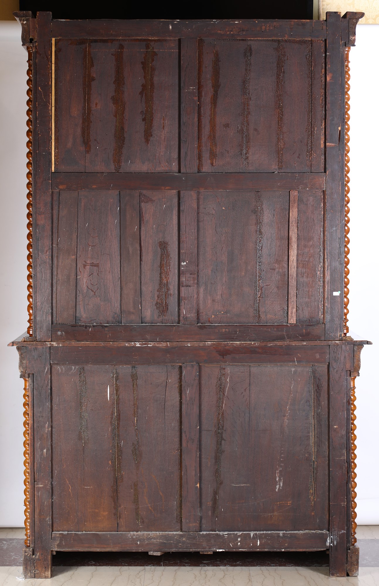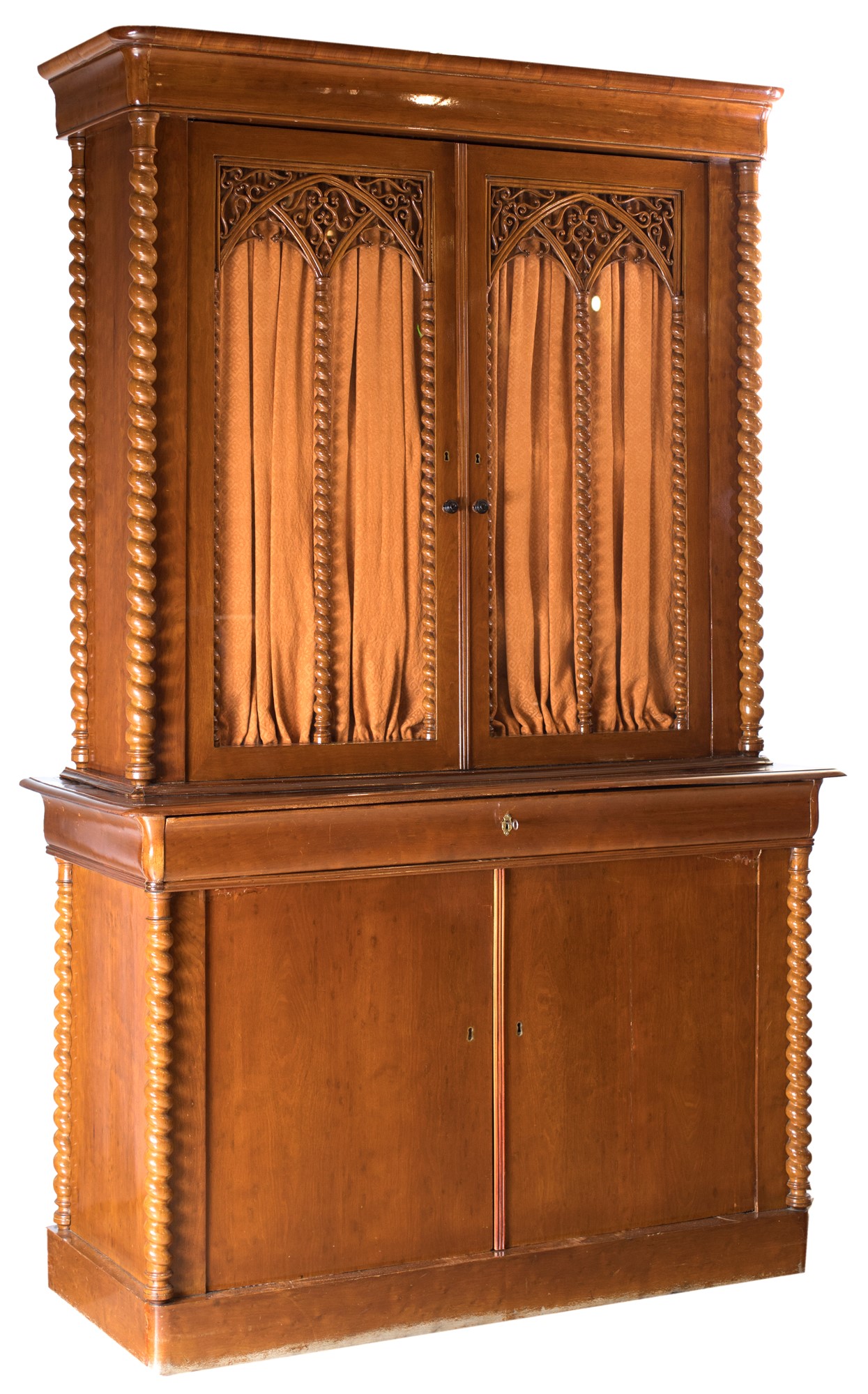 Credenza con alzata in mogano, XIX secolo, , cm 247x158x64, caratterizzata da colonne angolari tortili; corpo superiore con due sportelli a vetri con telaio di gusto neogotico; corpo inferiore con fascia modanata comprendente un cassetto e due sportelli sottostanti