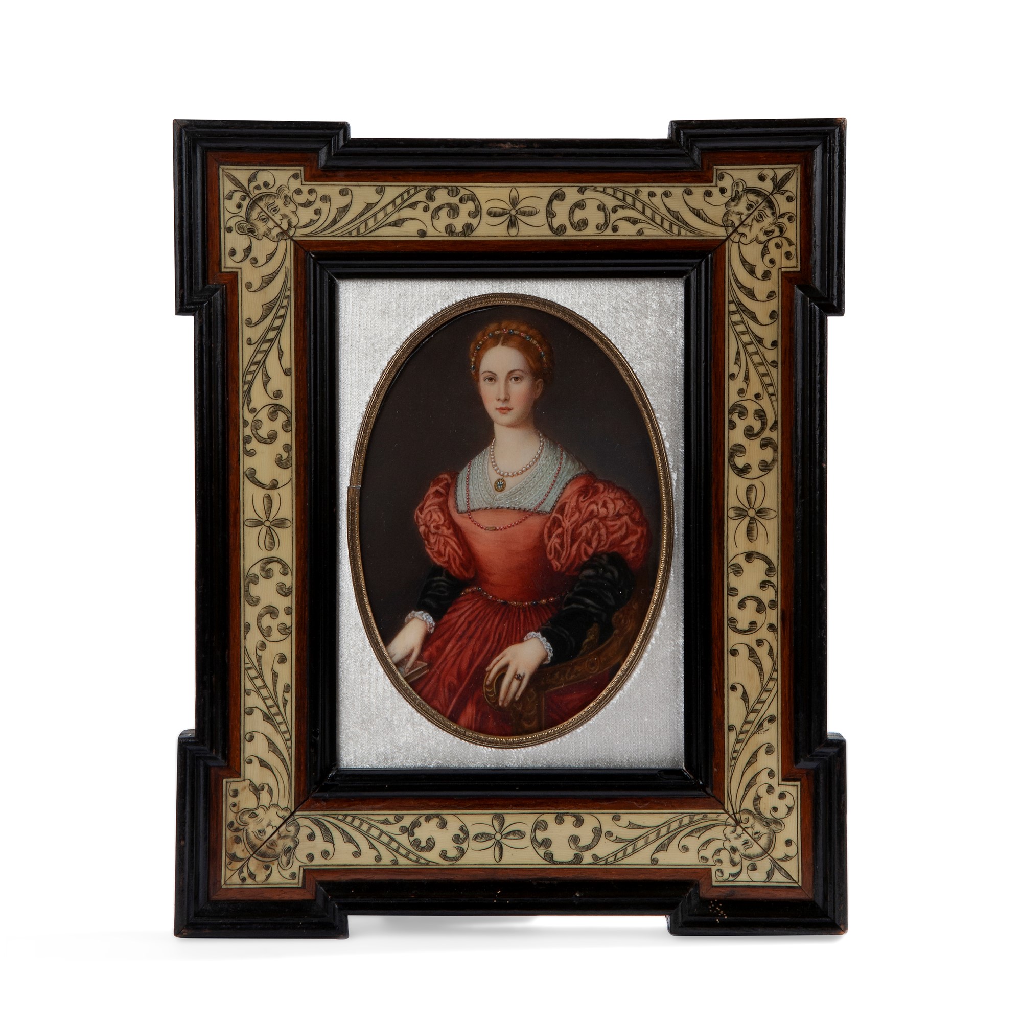Pittore del XVIII secolo, Ritratto di Lucrezia Panciatichi, tempera su avorio a sesto ovale, cm 15x10,5 - con la cornice: cm 29x24, dalla tavola originale di Agnolo Bronzino conservata agli Uffizi di Firenze. Traccia di iscrizione a destra non interamente decifrabile. Cornice in legno naturale ed ebanizzato del XIX secolo, con angoli cuspidati e fascia decorata da applicazioni in avorio con grottesche e motivi naturalistici graffiti di gusto rinascimentale.