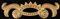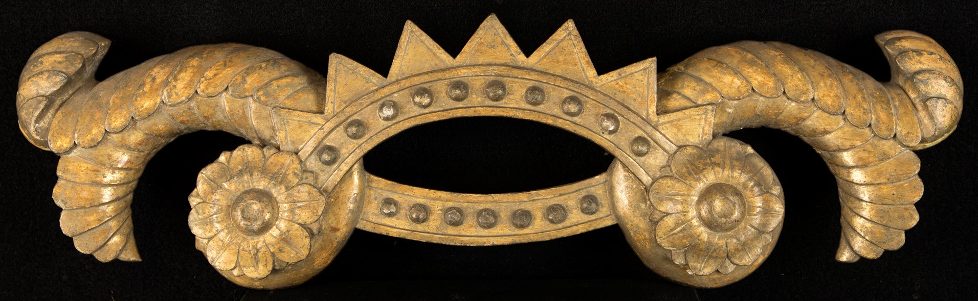Fregio in legno intagliato e dorato, cm 20x63, centrato da una mezza corona a sette punte emergente da rosoni con estremità ricurva