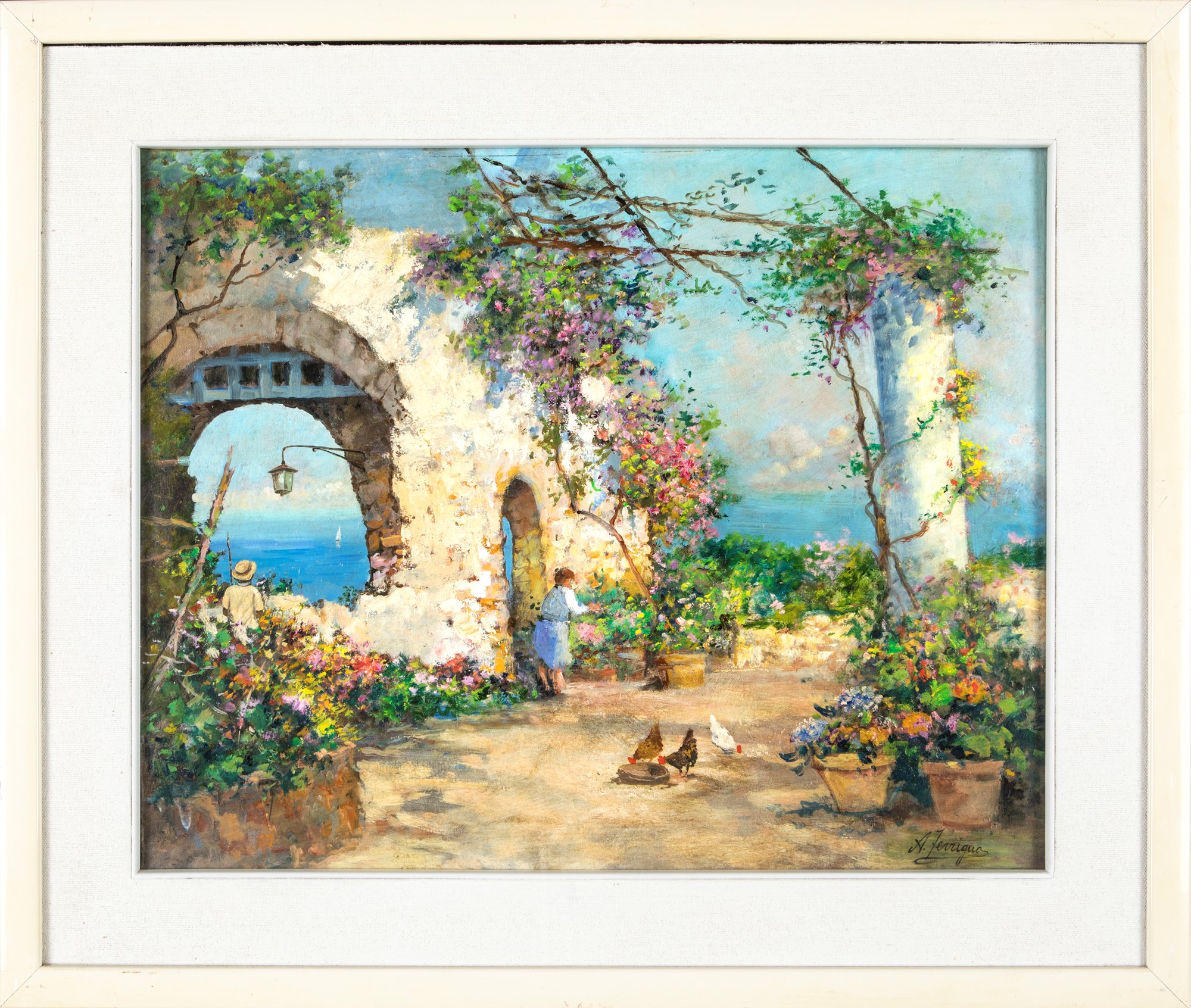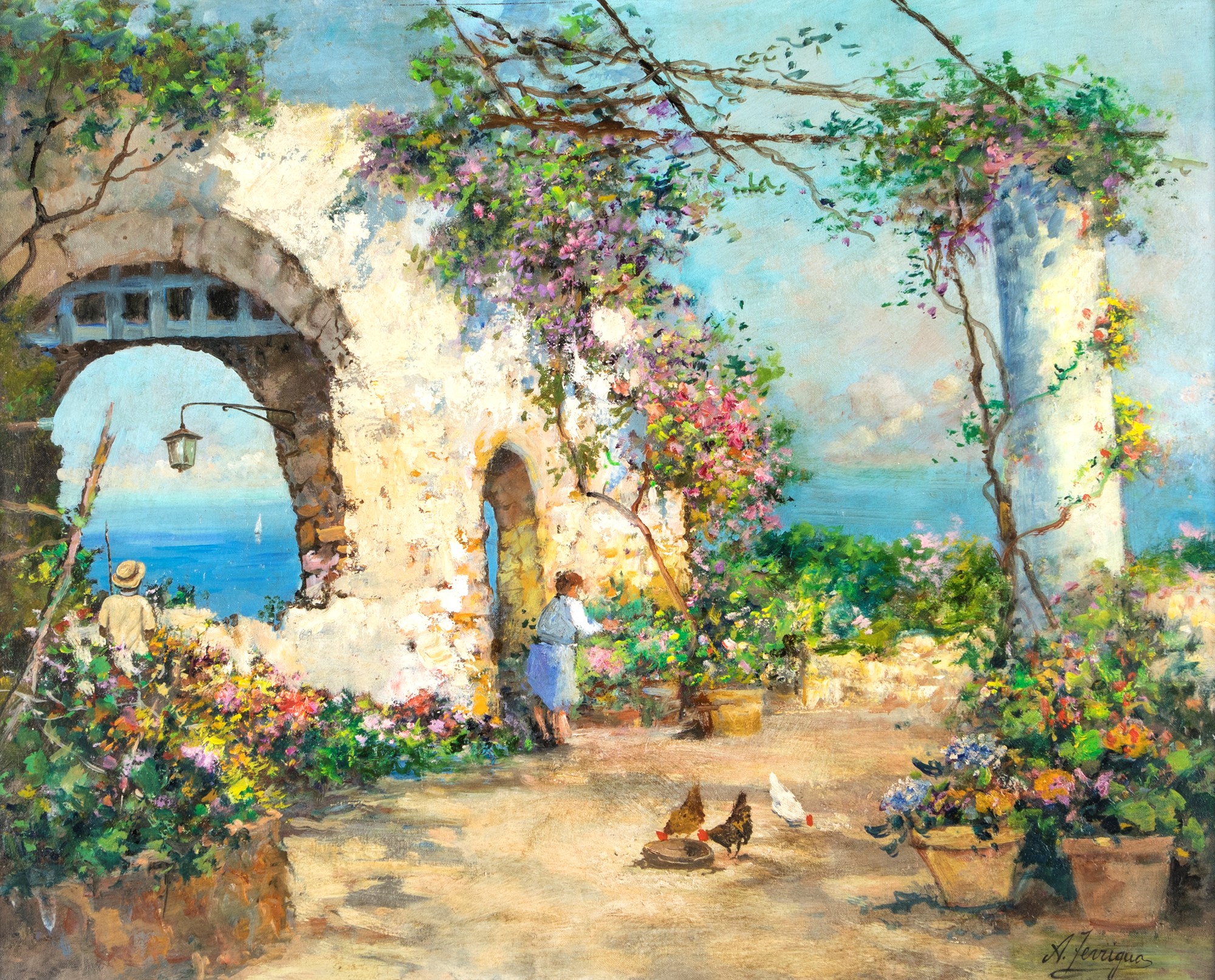 Ferrigno, Antonio (Maiori, 1863 - Salerno, 1940) , Terrazza fiorita sul mare, olio su tela, cm 40x50 - con la cornice: cm 54x64, Firmato A. Ferrigno in basso a destra