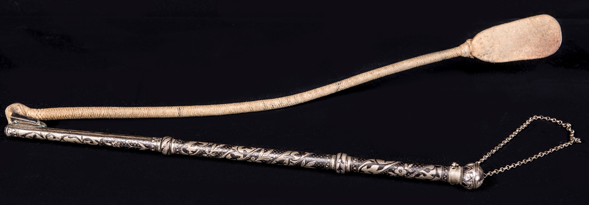 Frustino da carrozza con impugnatura in argento, cm 95 - peso complessivo gr. 198 , nteramente decorato a fasce elicoidali brunite alternate con decorazione a motivi vegetali incisi al bulino. Reca data 1925 incisa sulla sommità del pomolo ed una catenella al manicotto