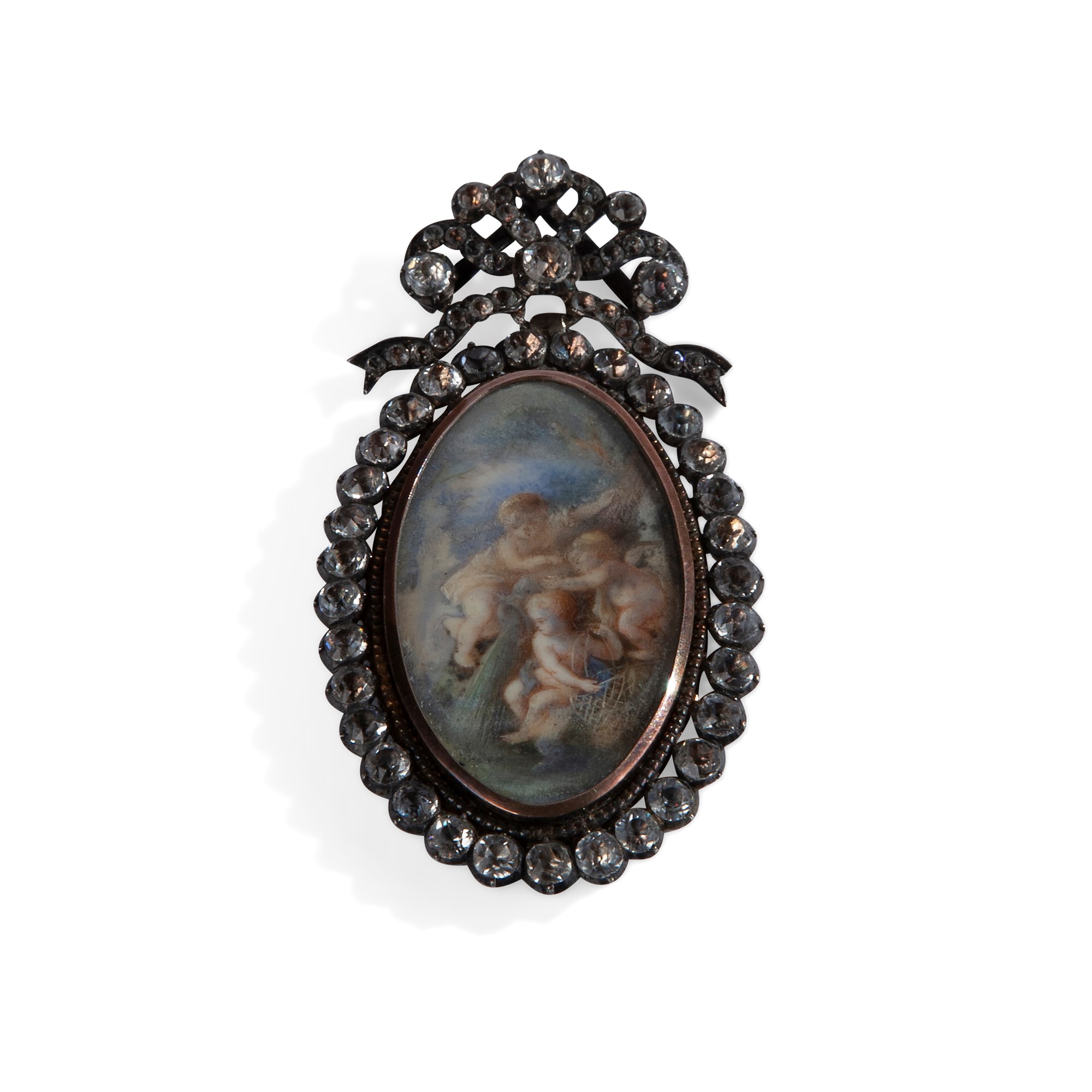 Spilla con miniatura, fine del XIX/inizio del XX secolo, cm 7x3,5, a forma di fiocco con pendente ovale decorato da amorini dipinti, sottolineato da strass disposti lungo il perimetro