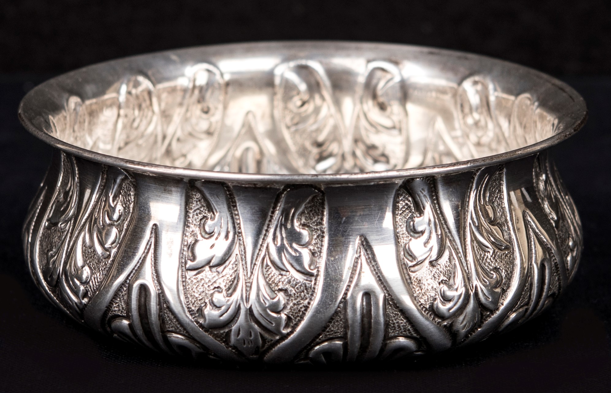 Piccolo cache-pot in argento 800/1000, cm 5x13 - gr. 130,ncon decorazione sbalzata a motivi vegetali contrapposti