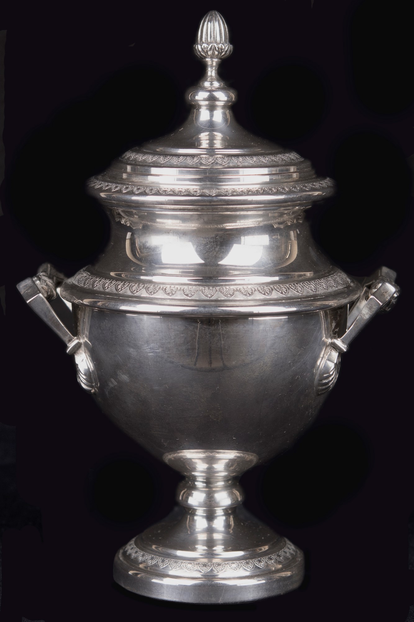 Zuccheriera biansata in argento stile Impero, Firenze, Anni Sessanta/Settanta, cm 18,7x12,5x9,5 - gr. 390, decorata da fasce cesellate e palmette; corpo ad anfora su piede circolare, coperchio soromontato da pignetta