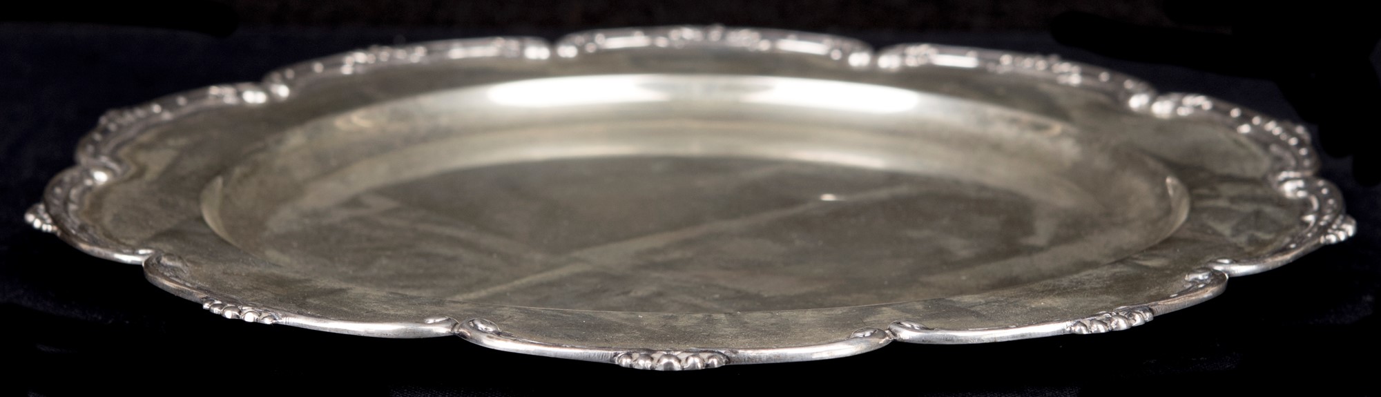 Piatto in argento 800/1000, diametro cm 30 - gr. 460, con profilo ad archetti determinati da volute