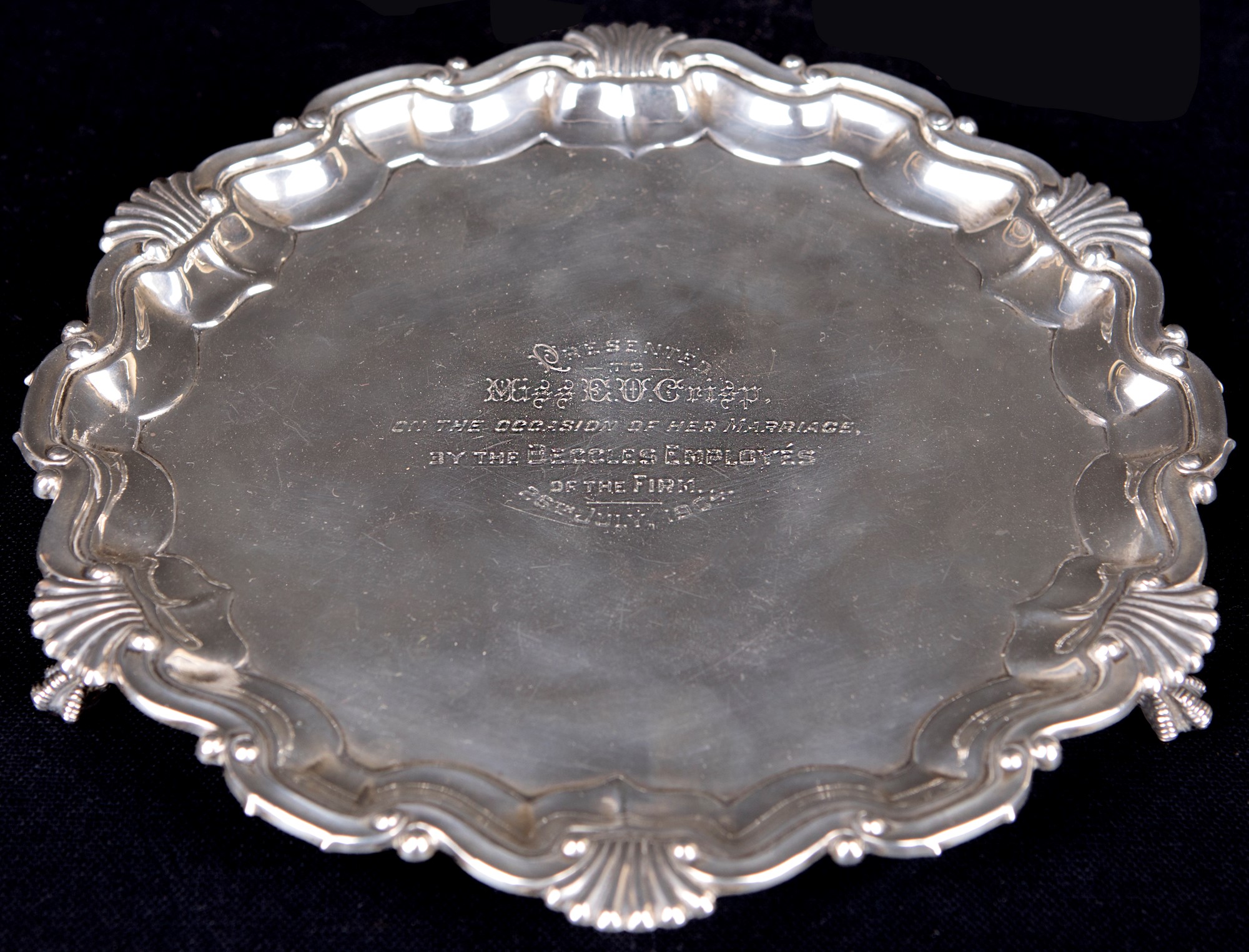 Salver in argento 925/1000, città di Sheffield, 1901, argentieri T.B. e S, cm 2x21,3 - gr. 314, con dedica incisa sul piatto e profilo sagomato modanato intervallato da valve baccellate