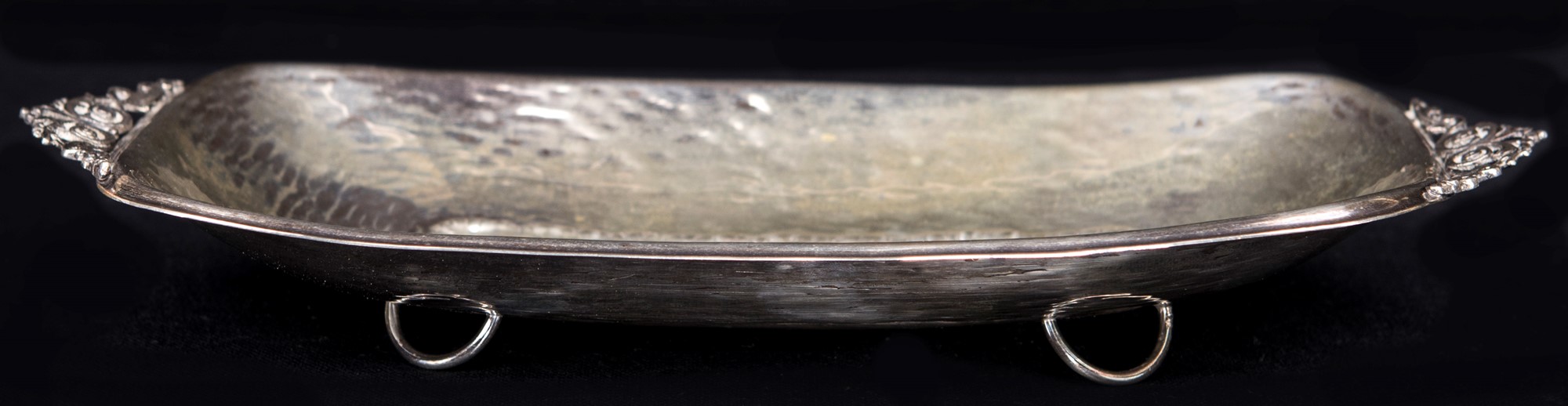 Vaschetta rettangolare in argento, cm 4x27x12 - gr. 244 ,con angoli stondati ed anse a forma di volute vegetali; piedi ad archetto