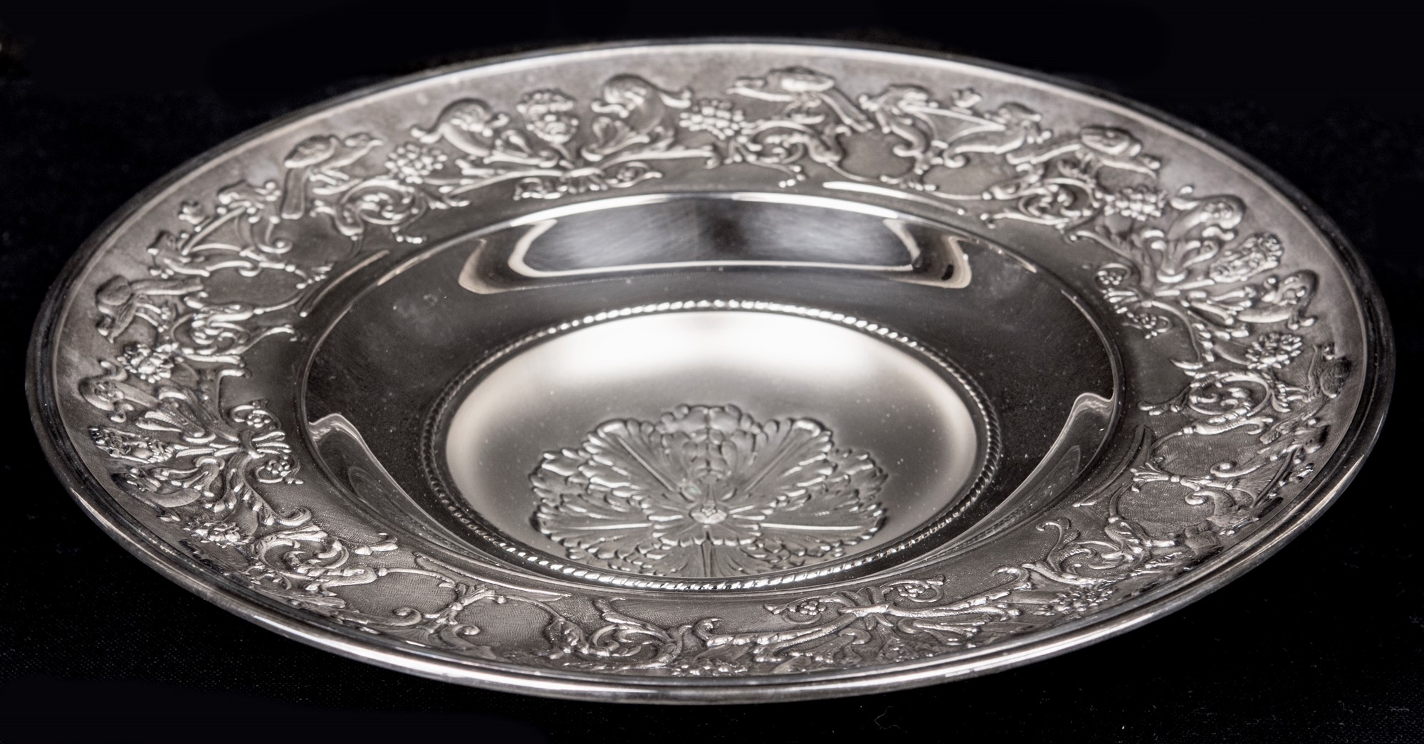 Centrotavola in argento, cm 5,5x30 - gr. 364, con fitta decorazione a motivi naturalistici disposta sulla tesa ed al centro del cavetto