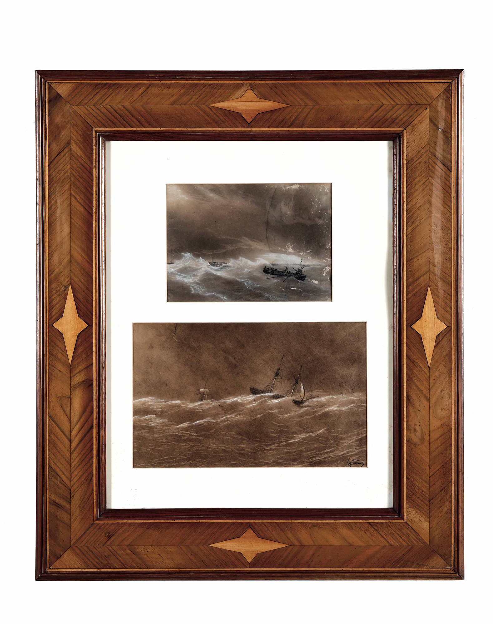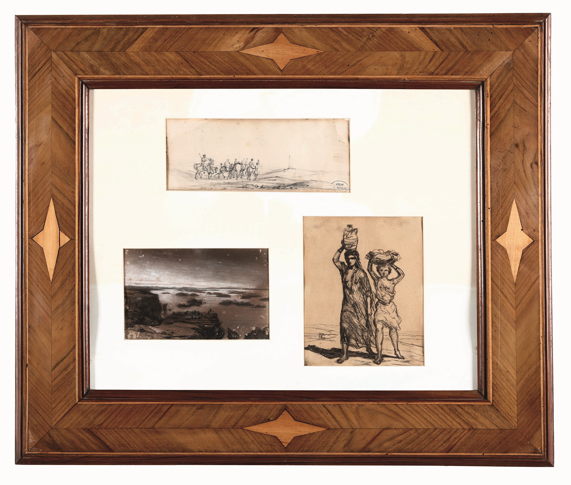 Atlier di Charles Eustache (1820 - 1870), Insieme di cinque disegni entro coppia di cornici in legno lastronato ed intarsiato. XIX-XX secolo, cm 86x72 luce cm 62x47