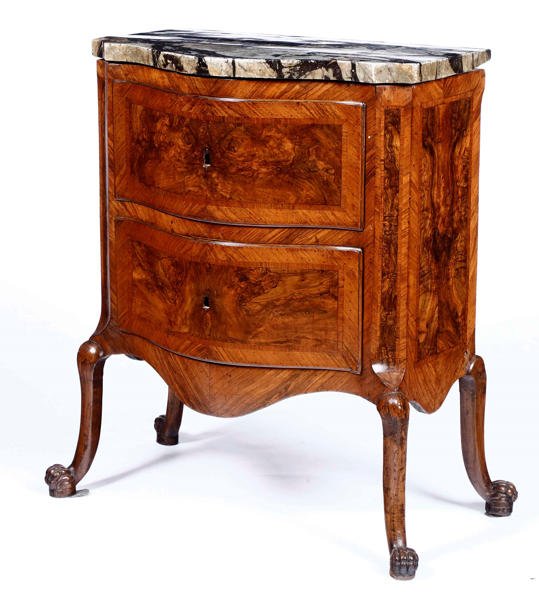 Piccolo cassettone lastronato in radica. XVIII secolo, fronte mosso a due cassetti, piedi ferini, piano in marmo, W. 76 - D. 46 - H. 97 cm