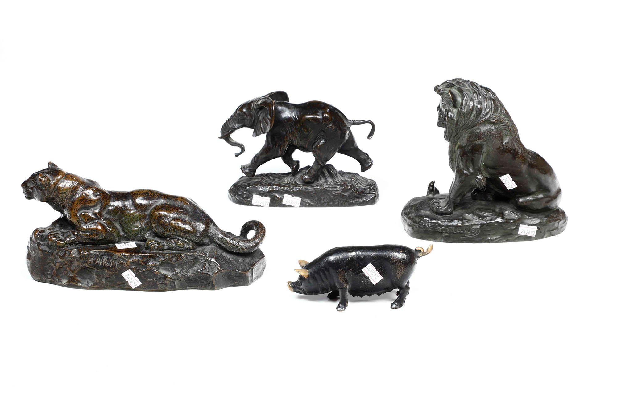 Quattro animali in bronzo firmati C. Masson e Barye, XIX-XX secolo, tra cui leone e tigre