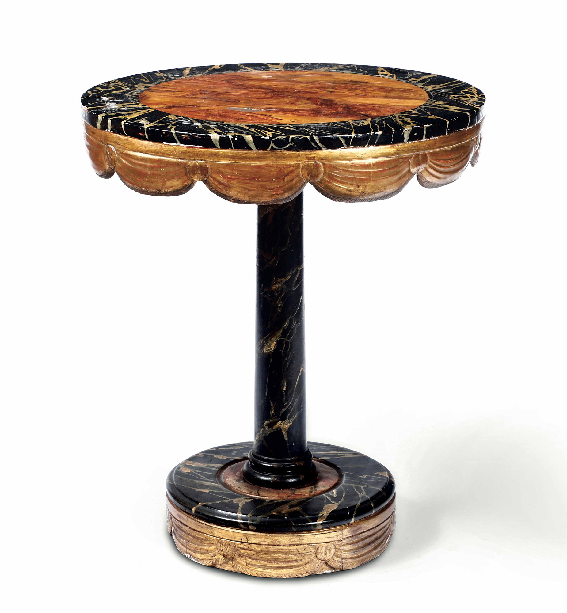 Tavolino di forma circolare in legno laccato a finto marmo e dorato, XX secolo, costruito con elementi antichi