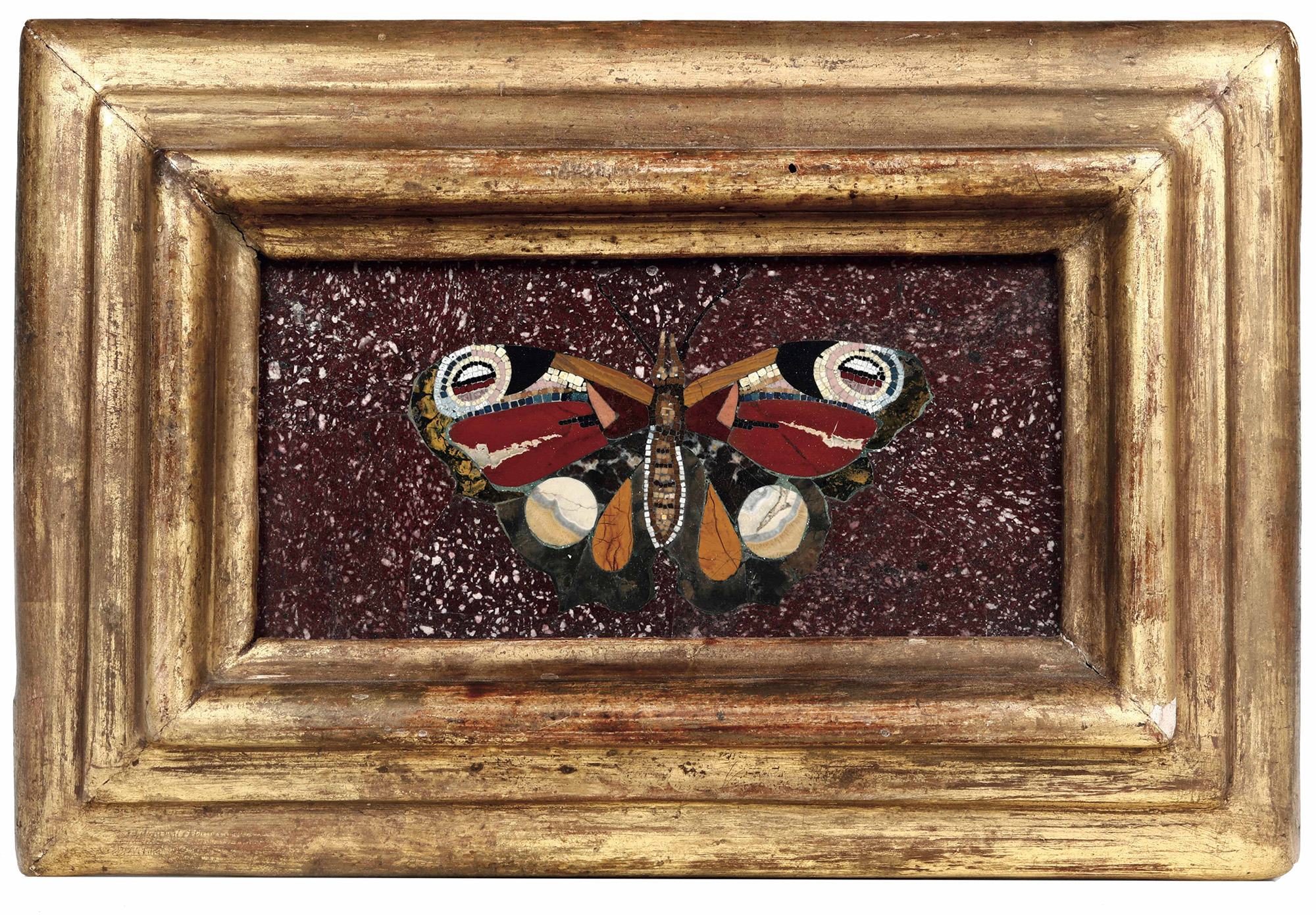 Micromosaico raffigurante farfalla, su fondo in porfido. XX secolo, entro cornice in legno modanato e dorato