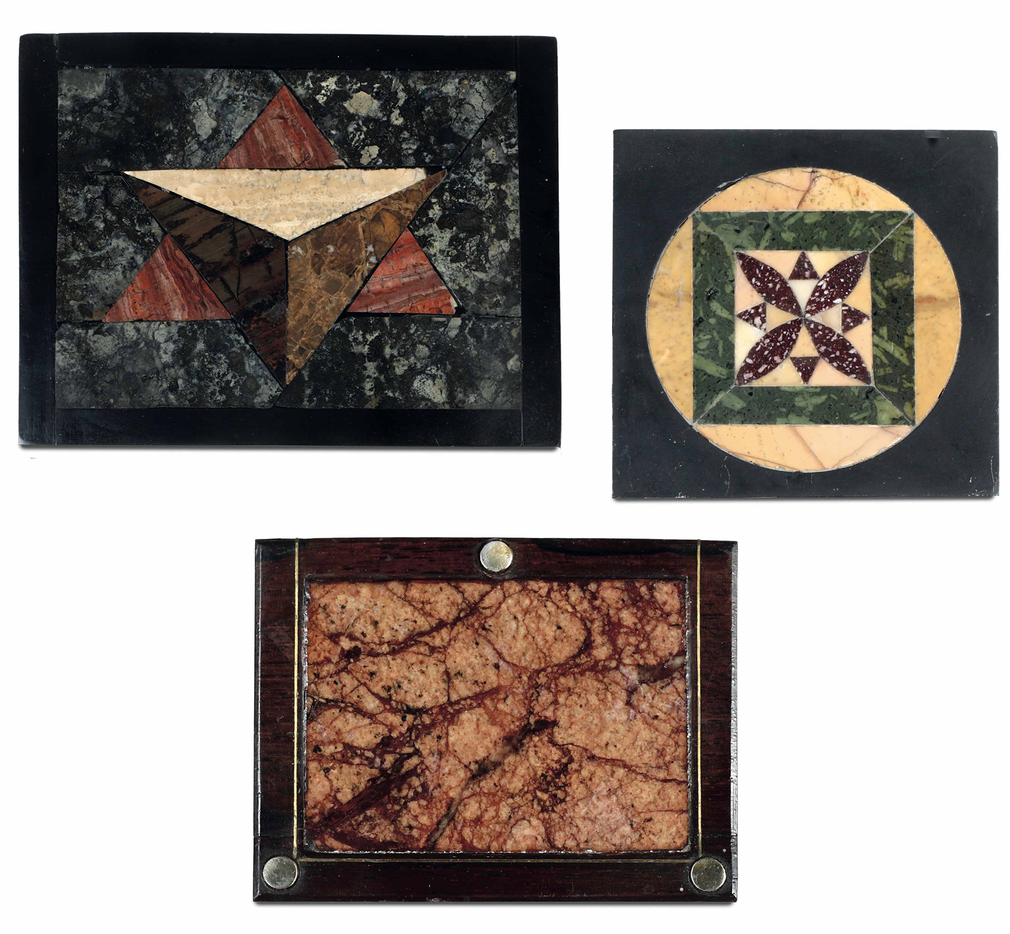 Gruppo di tre presse papier in commesso di marmi. XX secolo, uno a motivo floreale e uno con stella