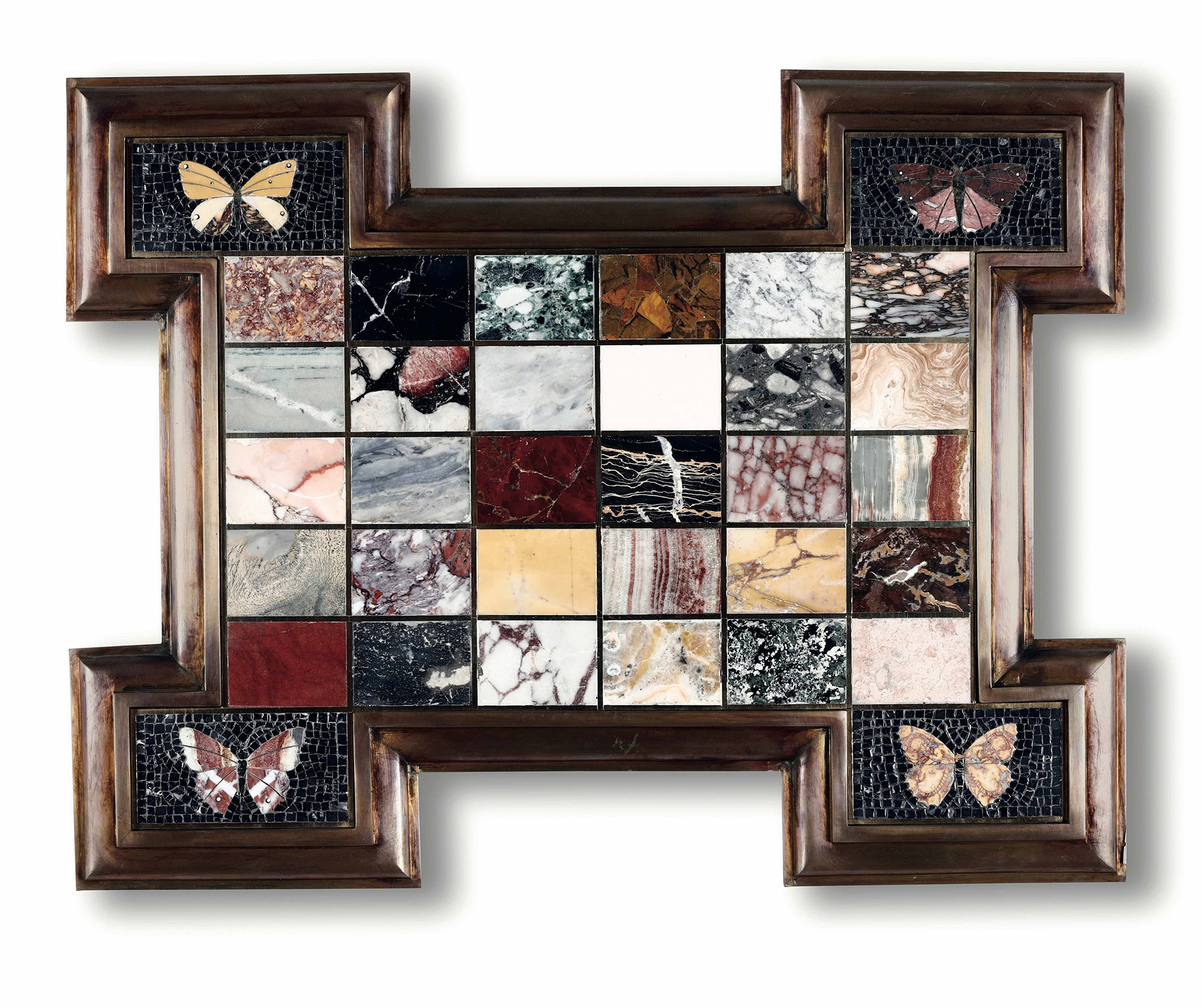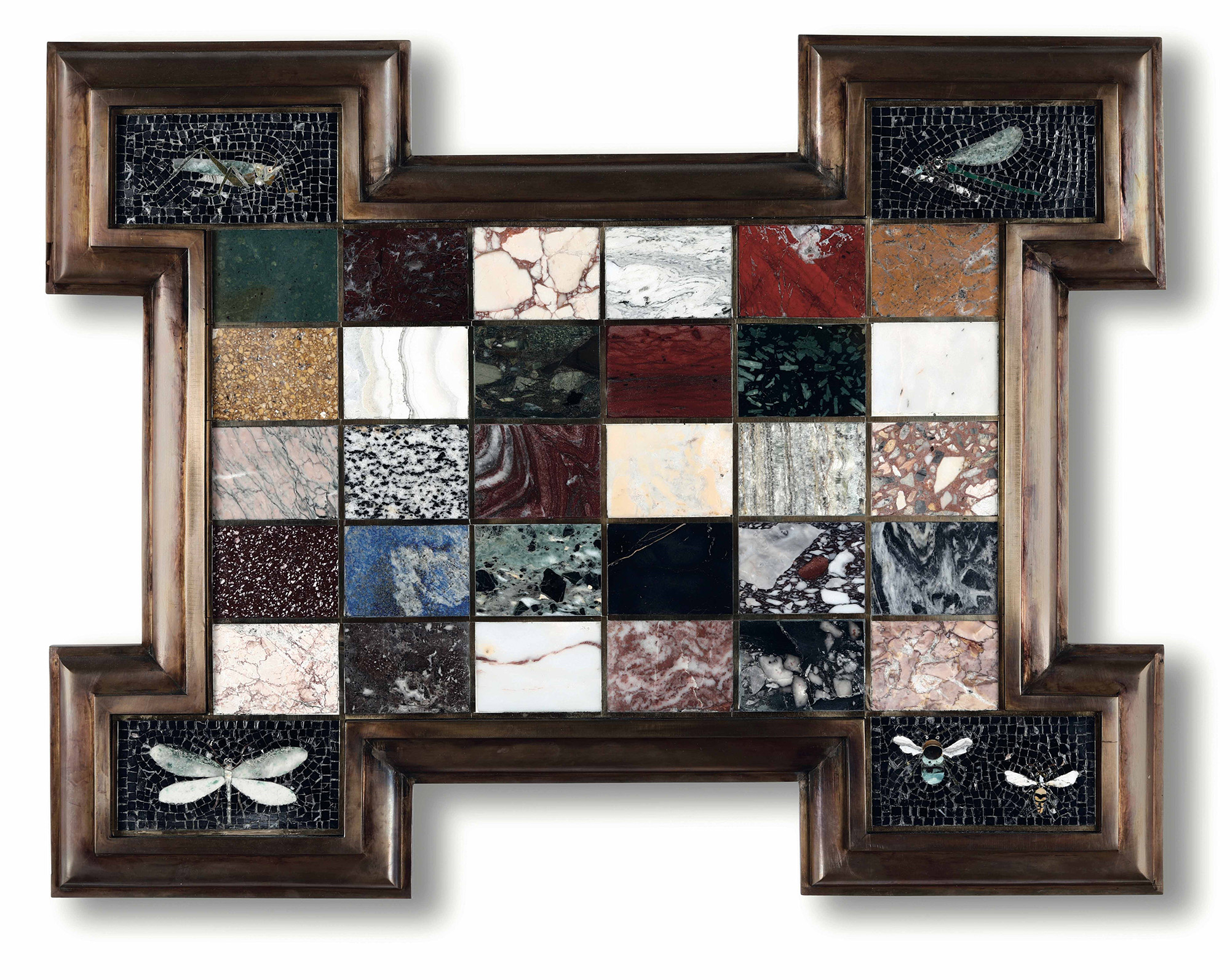 Coppia di commessi di marmi antichi e micromosaici a foggia di insetti. XX secolo