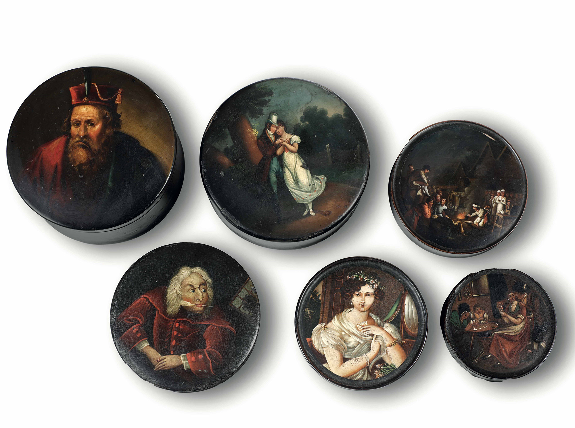 Gruppo di sei tabacchiere in legno e papier machè. Arte del Nord Europa XVIII-XIX secolo
