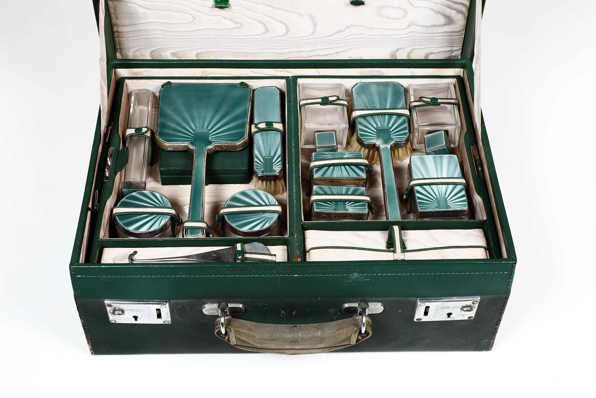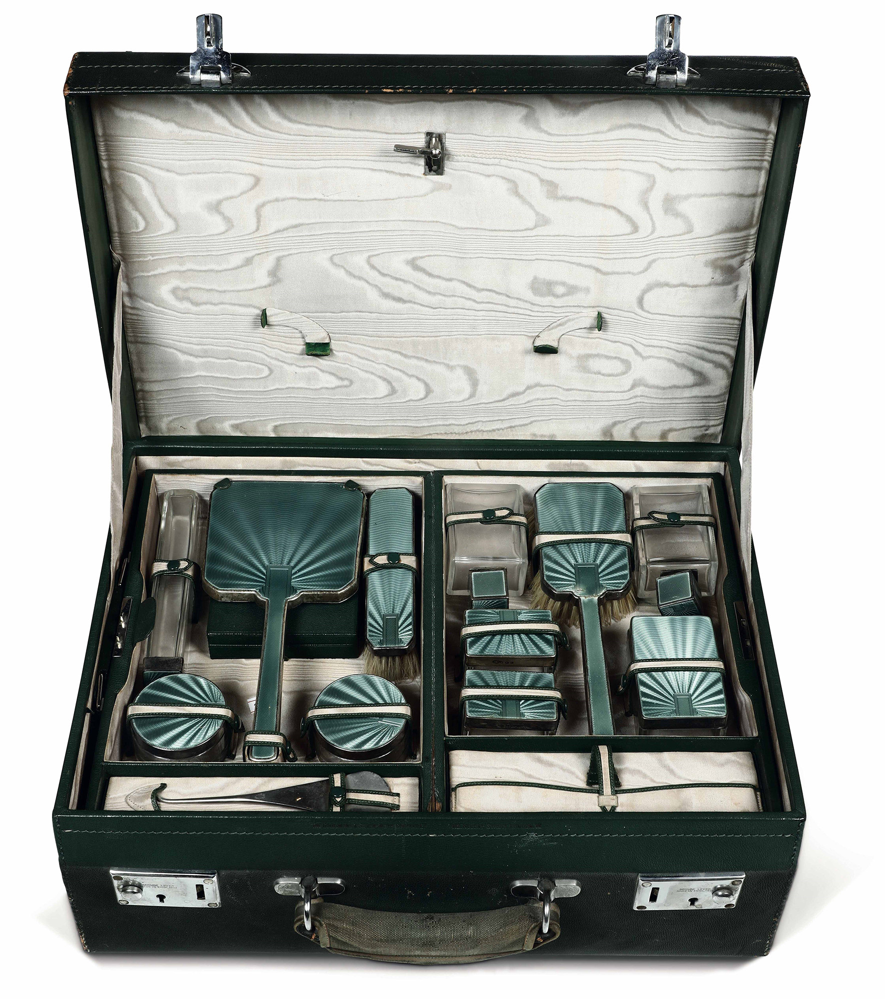 Servizio da toilette in argento e smalti. Inghilterra, bolli della città di Birmingham per l'anno 1935, argentieri The Goldsmiths & Silversmiths Company, in custodia originale