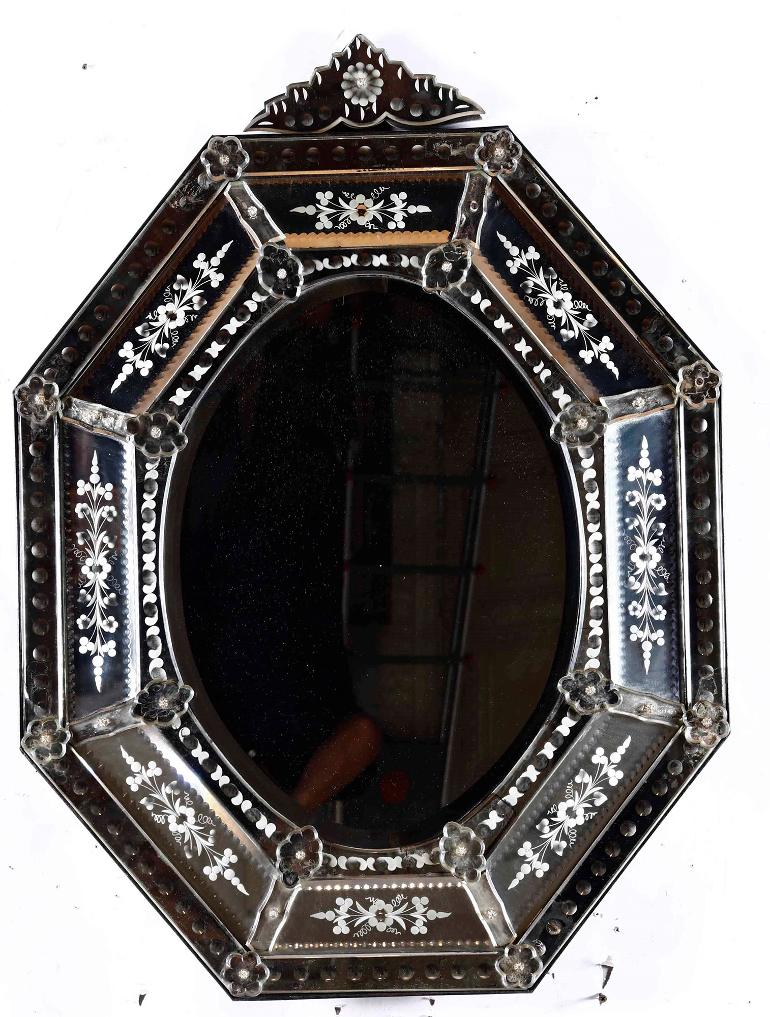 Specchiera ottagonale in vetro di Murano inciso, XX secolo, (difetti) cm 98x62