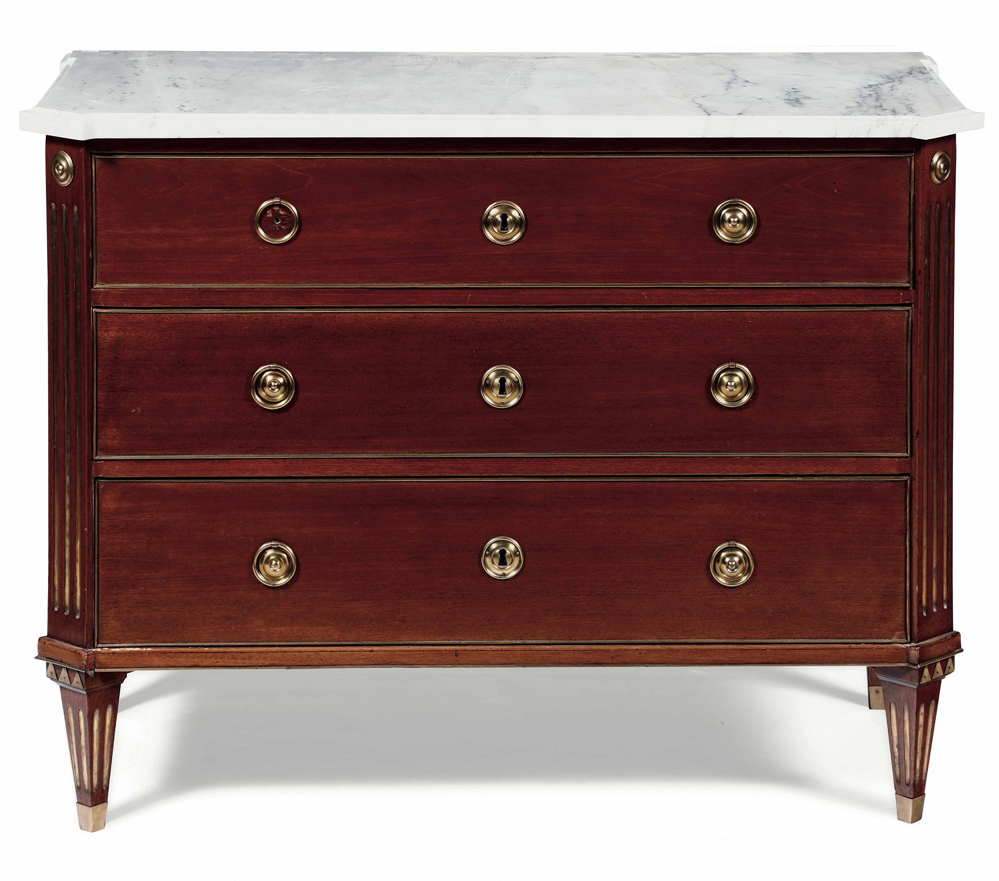 Comò in stile direttorio. XIX-XX secolo, piano in marmo bianco, gambe troncopiramidali, lesene scantonate e rastremate, W. 100 - D. 54 - H. 84 cm