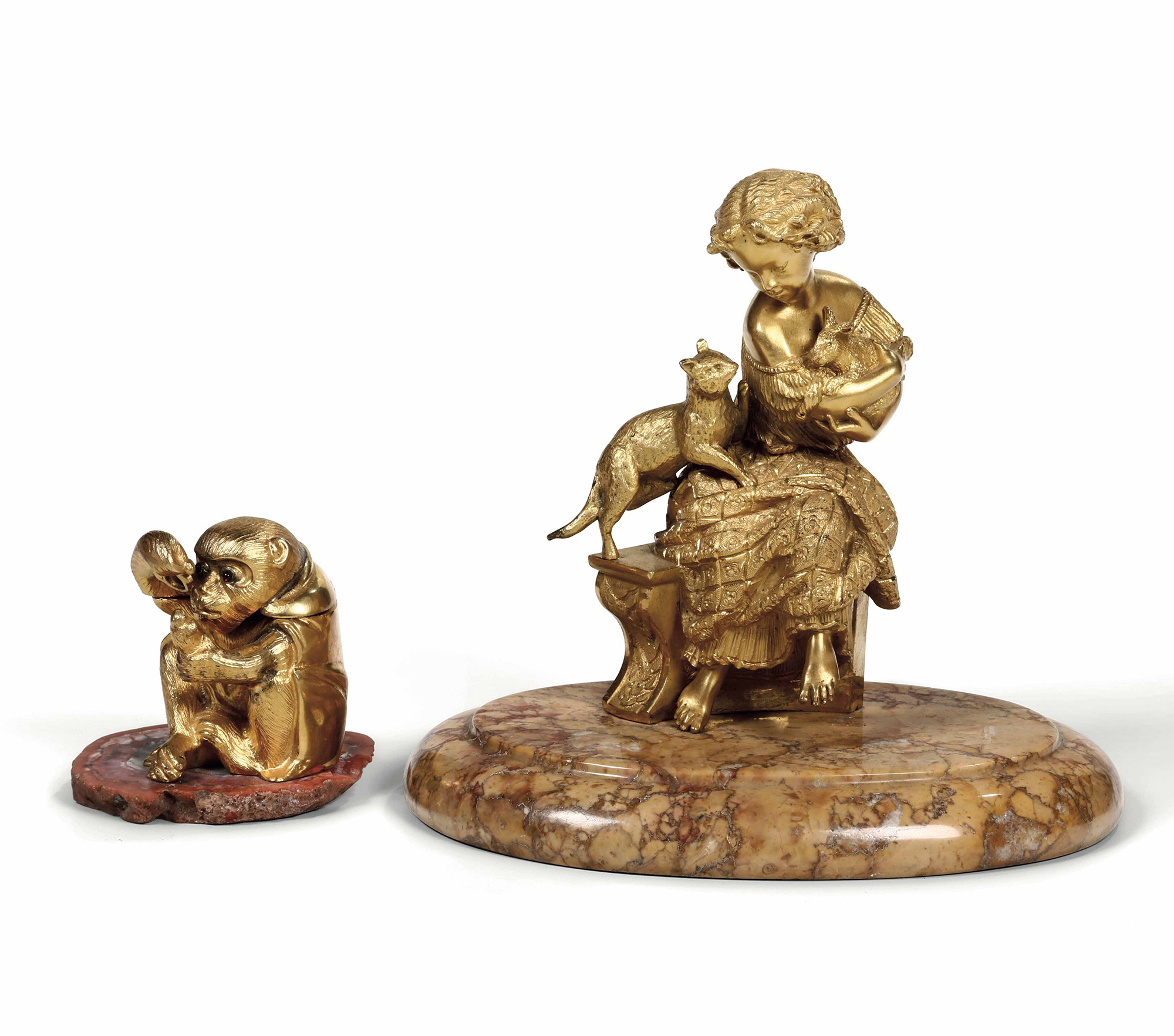 Lotto di due bronzetti dorati raffiguranti scimmietta e bimba con gatto e coniglio. Manifattura del XIX-XX secolo