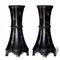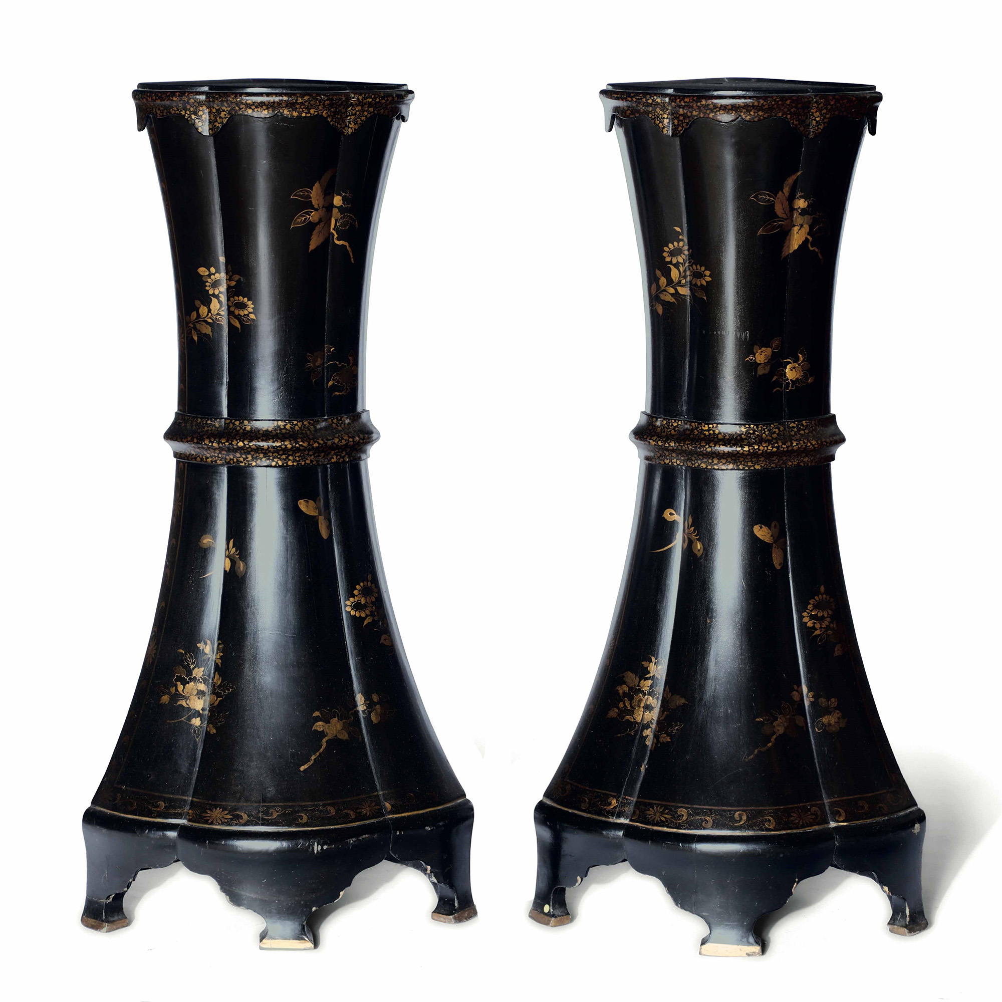 Coppia di gueridons ad angolo in legno ebanizzato, Inghilterra XVIII-XIX secolo, decori dorati a motivi floreali e insetti, H. 109 cm