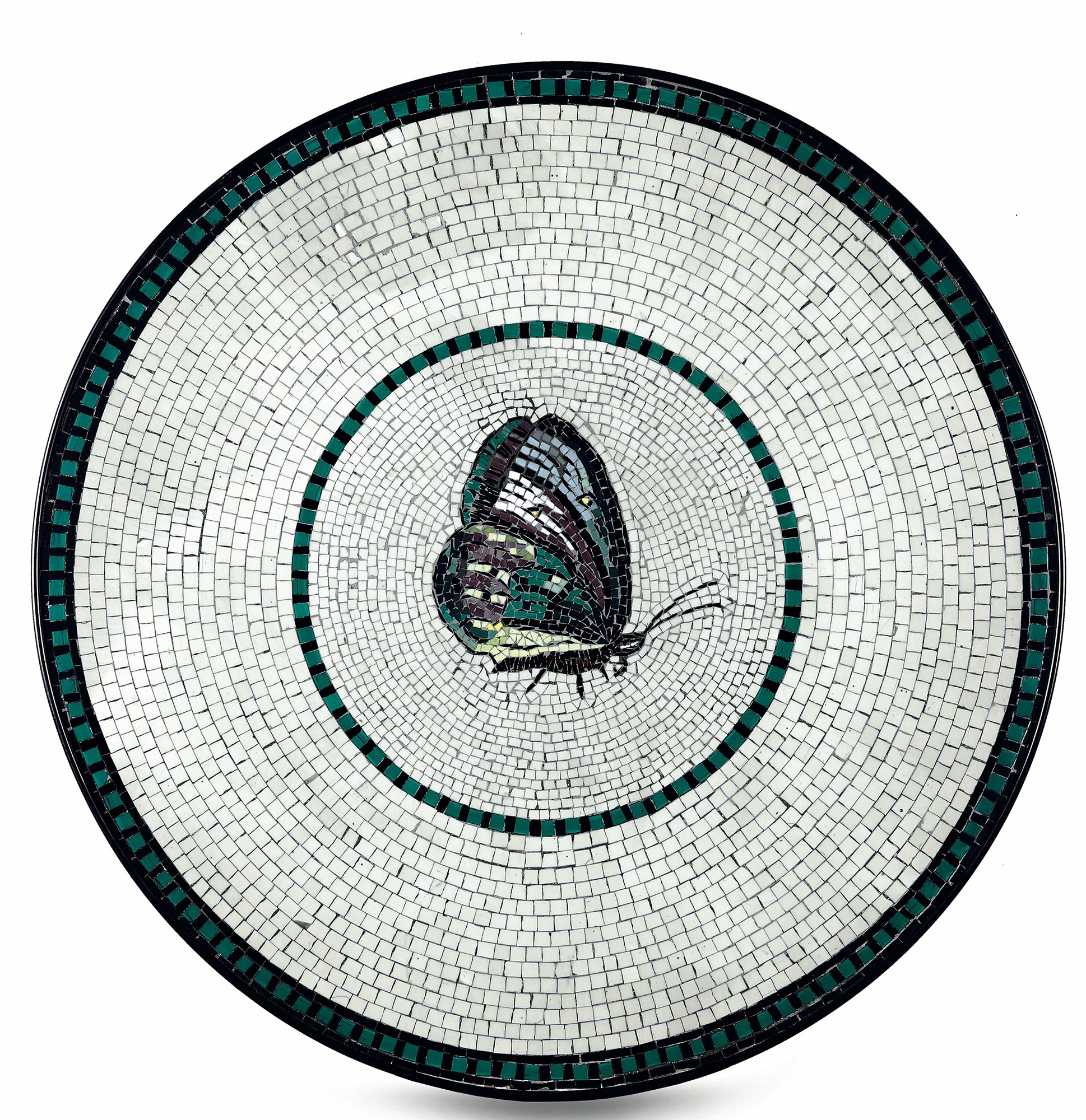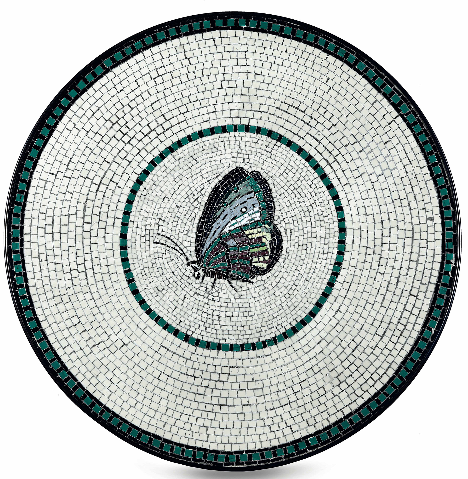 Coppia di tavolini con struttura in ferro e piano circolare a mosaico. XX secolo, al centro decoro di farfalle, altezza cm 76, diametro cm 63