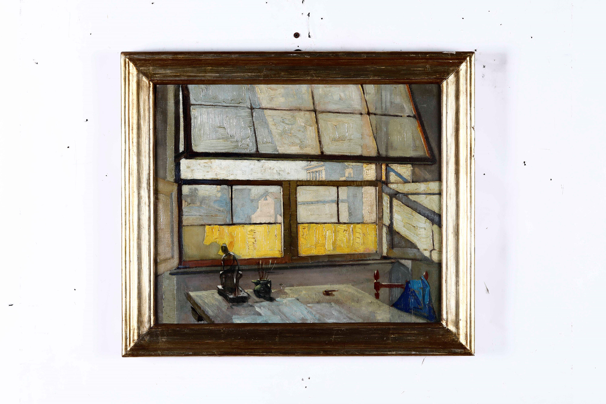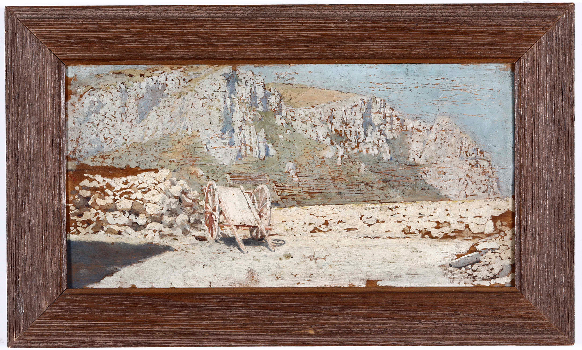 Due dipinti diversi, paesaggio con carretto e interno con finestra, olio su tavola e olio su tela