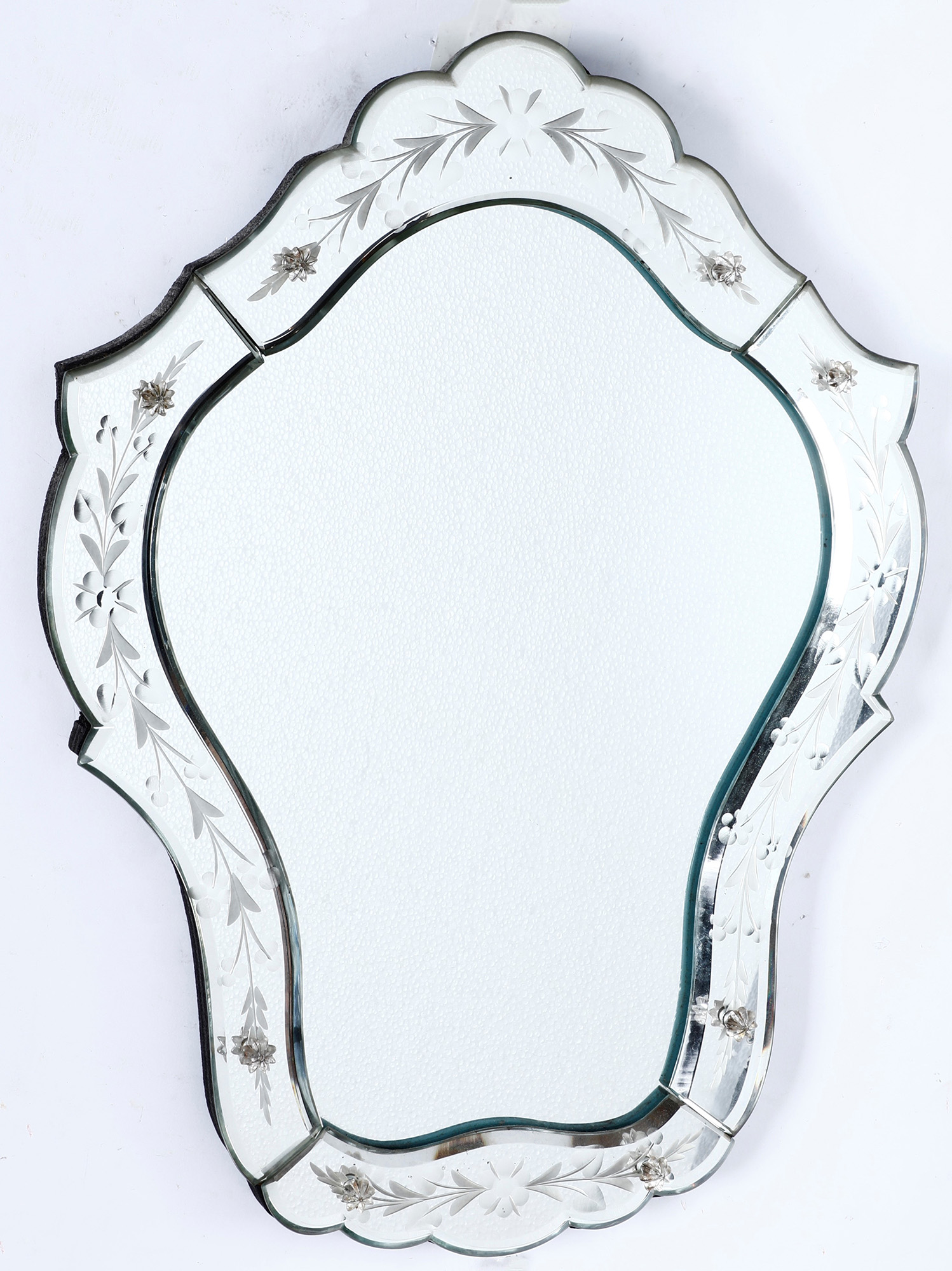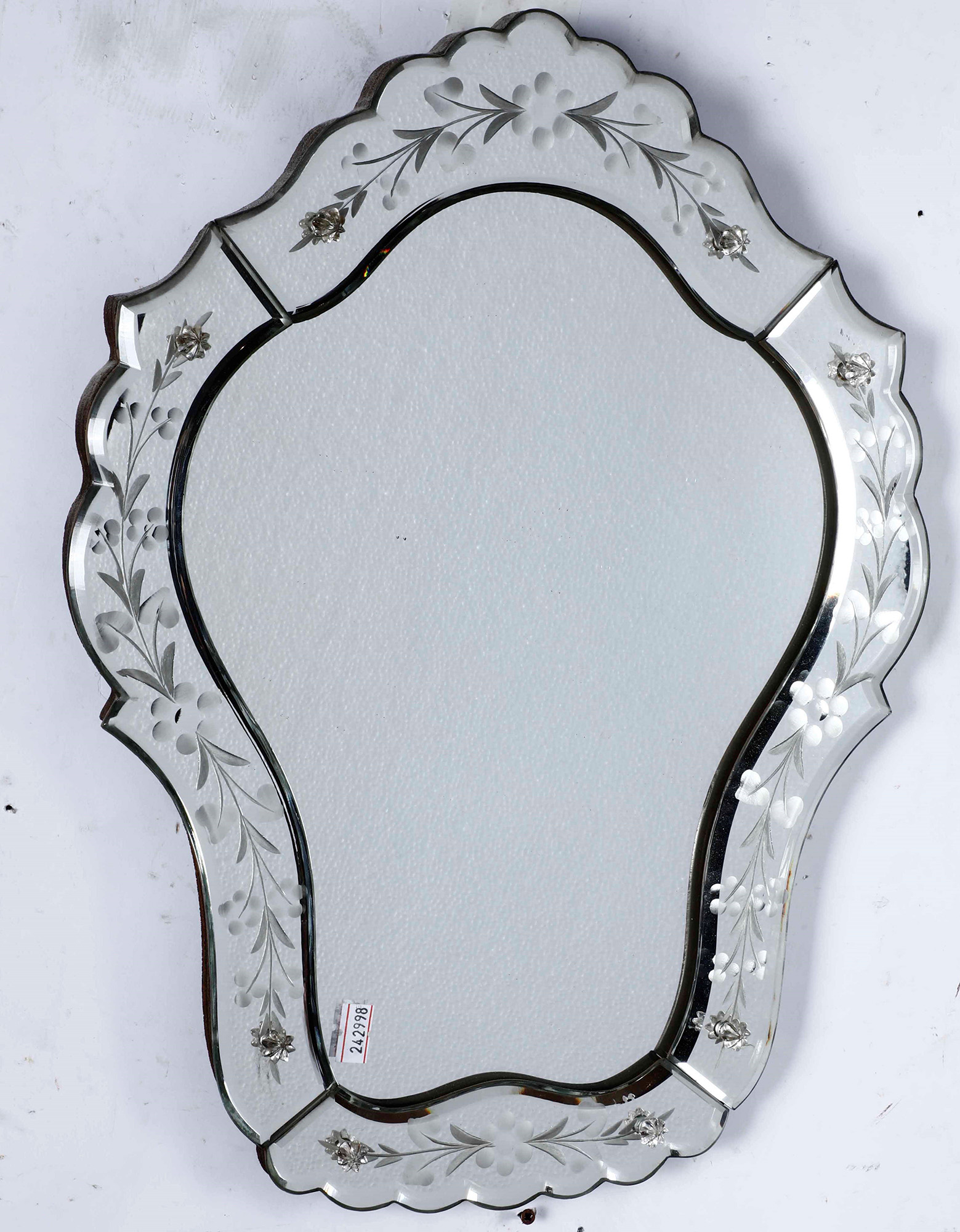 Coppia di piccole specchiere in vetro di Murano sagomato e inciso. XX secolo, fascia incisa a motivi floreali, W. 32 - H. 42 cm