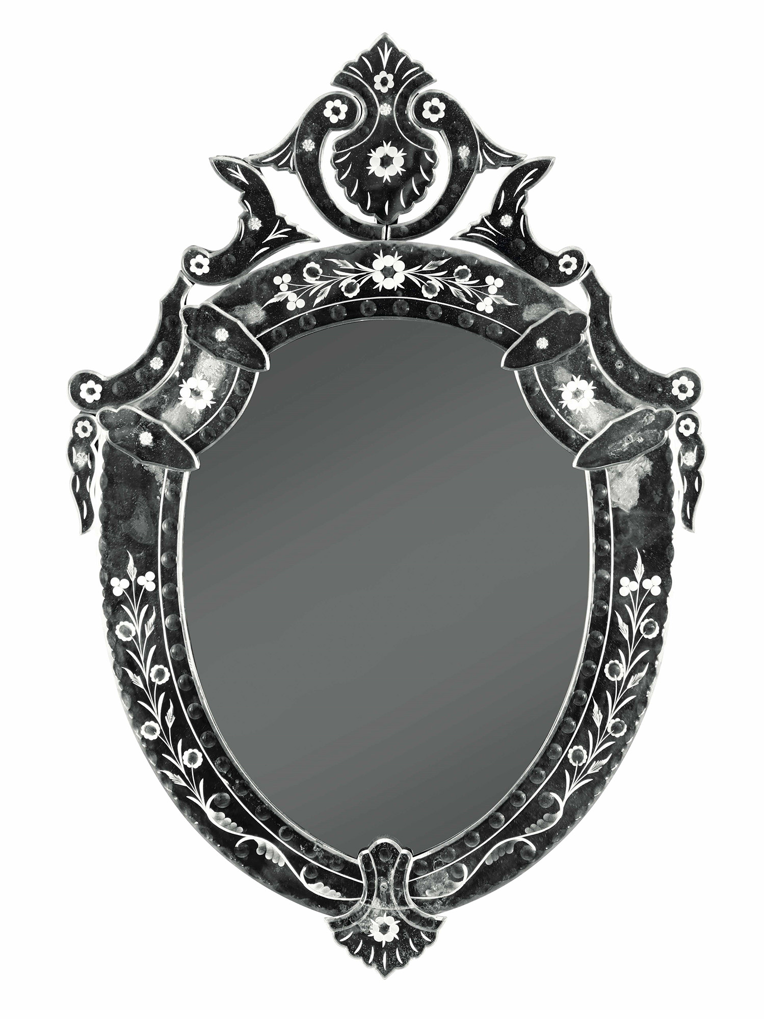 Specchiera a scudo in vetro di Murano inciso. XX secolo, cimasa con motivi a volute e fascia incisa con tralci floreali, W. 68 - H. 100 cm
