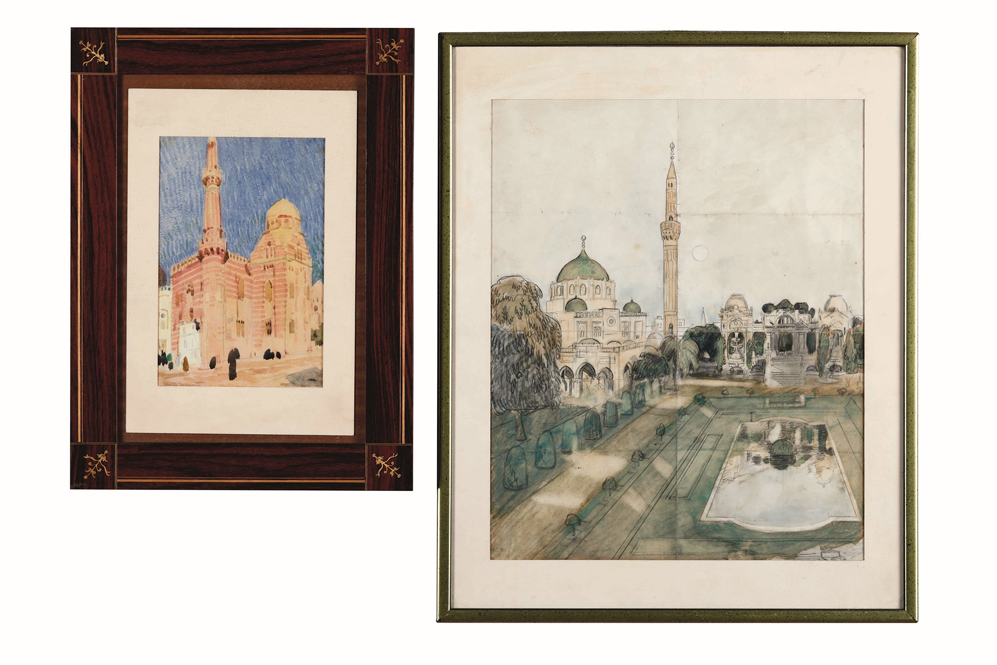 Lotto di due disegni, Scorci di monumenti orientali, tecnica mista, cm 41x33 e cm 22x15