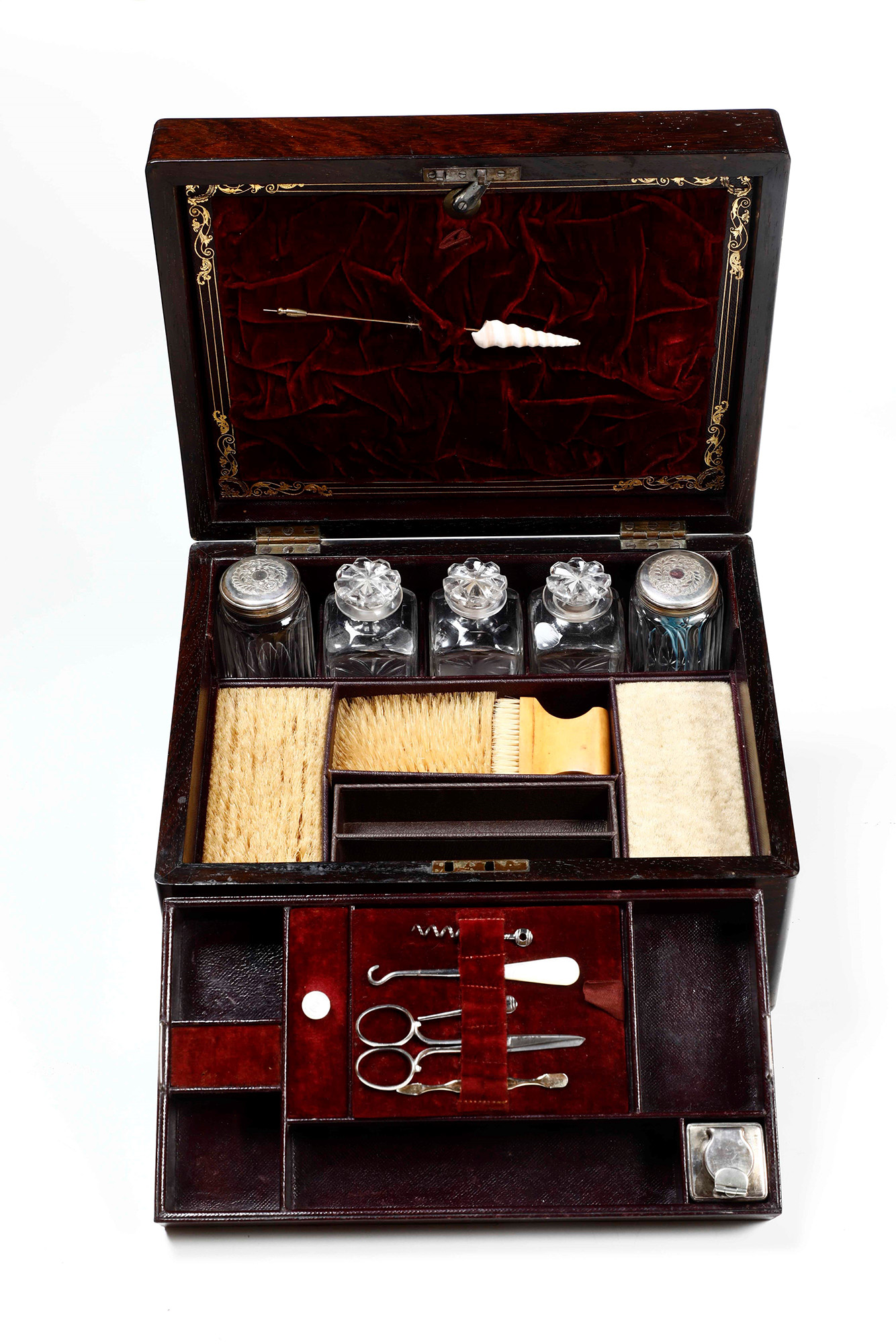 Set da toilette, XIX secolo, entro custodia in legno con finiture in metallo dorato