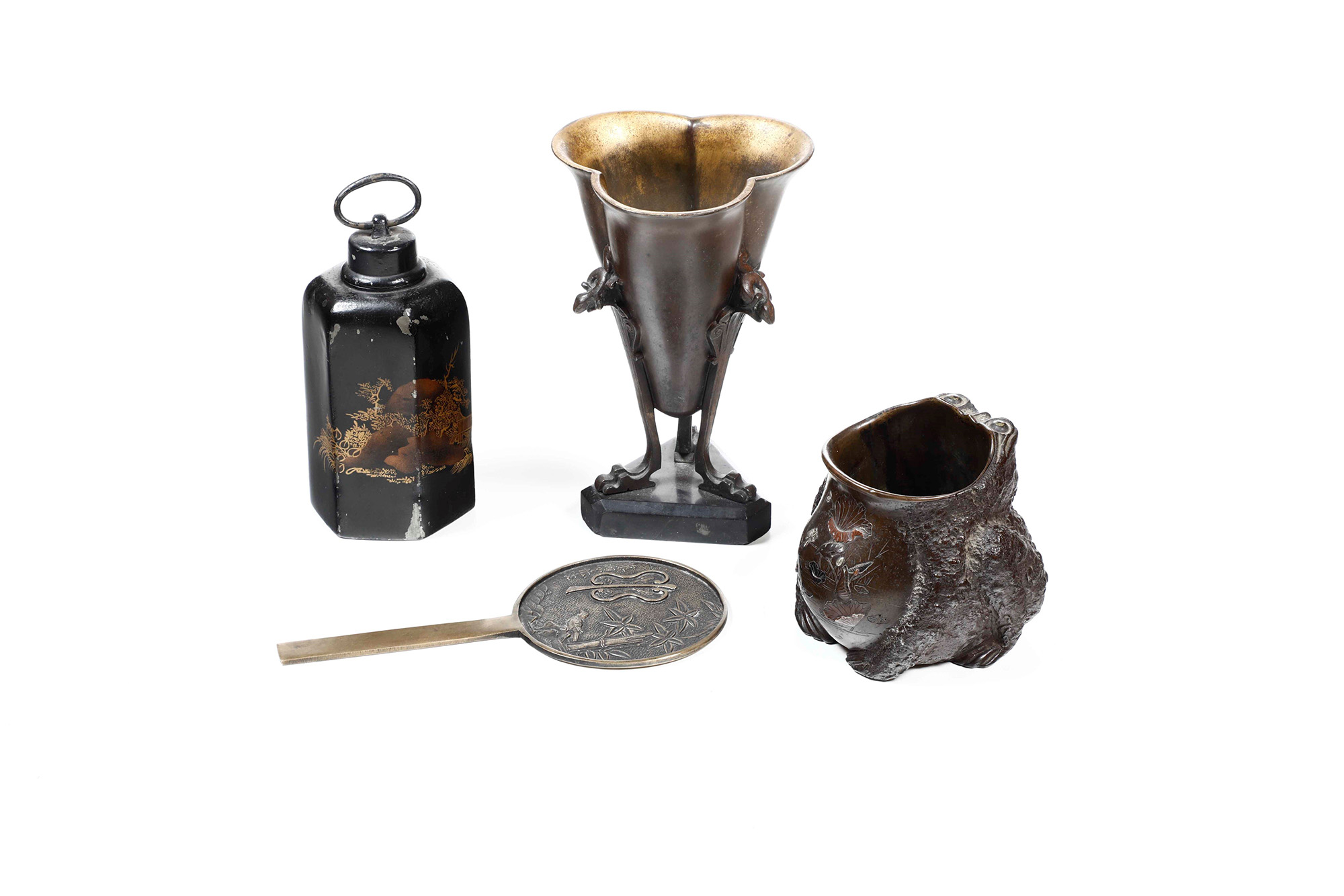 Lotto di oggetti orientali, vaso a rana, vaso trilobato, specchio e bracciale