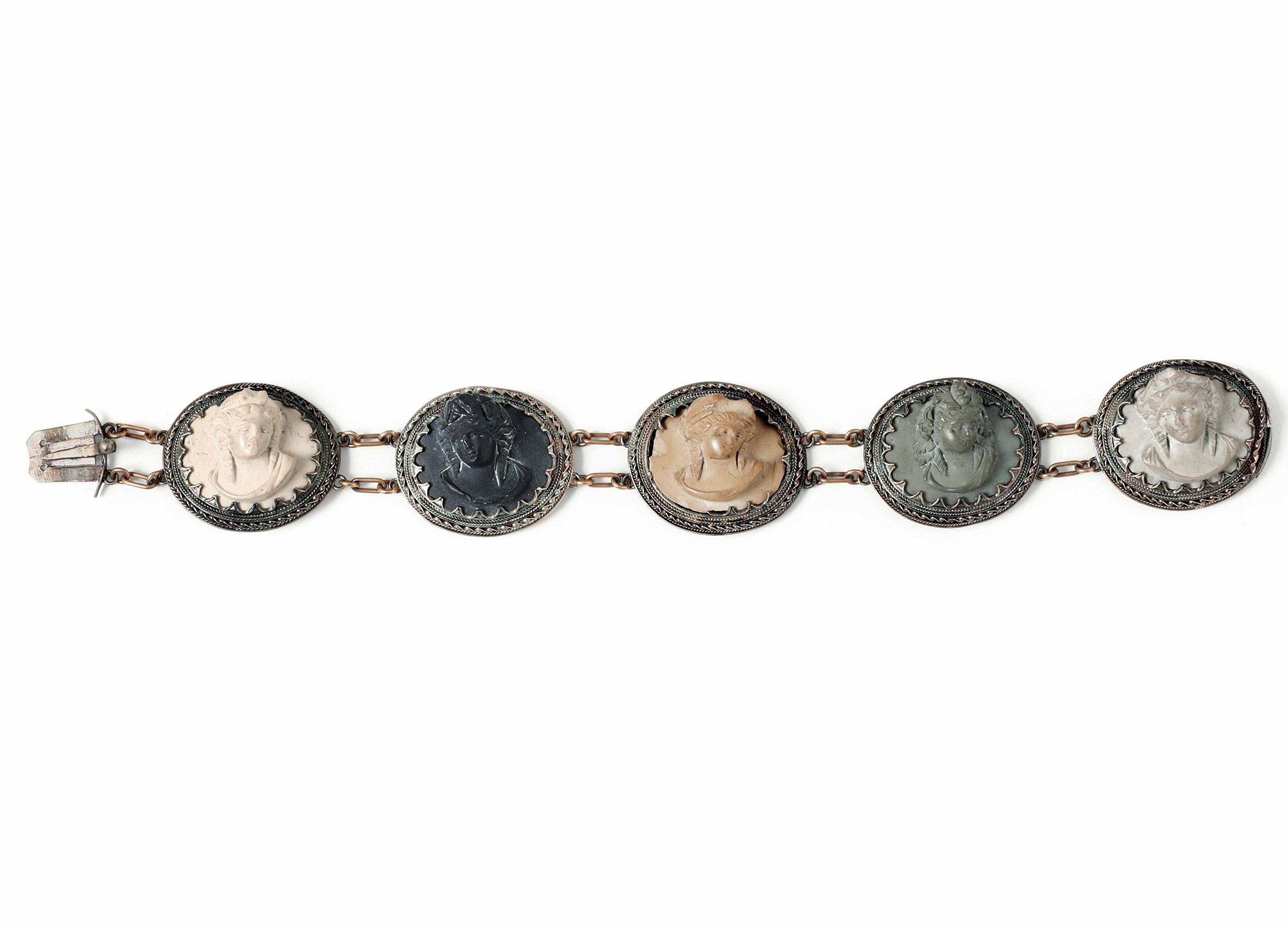 Bracciale con montatura in oro a basso titolo e inserti di protomi femminili in pietra lavica (?) XIX-XX secolo, cm 19