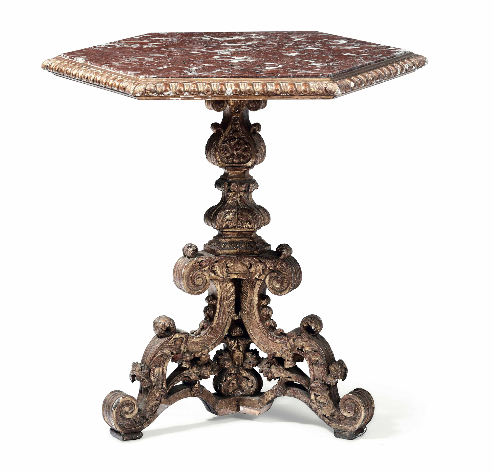 Tavolino in legno intagliato e dorato costruito con elementi antichi, piano esagonale in marmo rosso incassato entro cornice bacellata; fusto centrale tornito terminante su piedi a voluta, W. 74 - D. 74 - H. 73 Cm