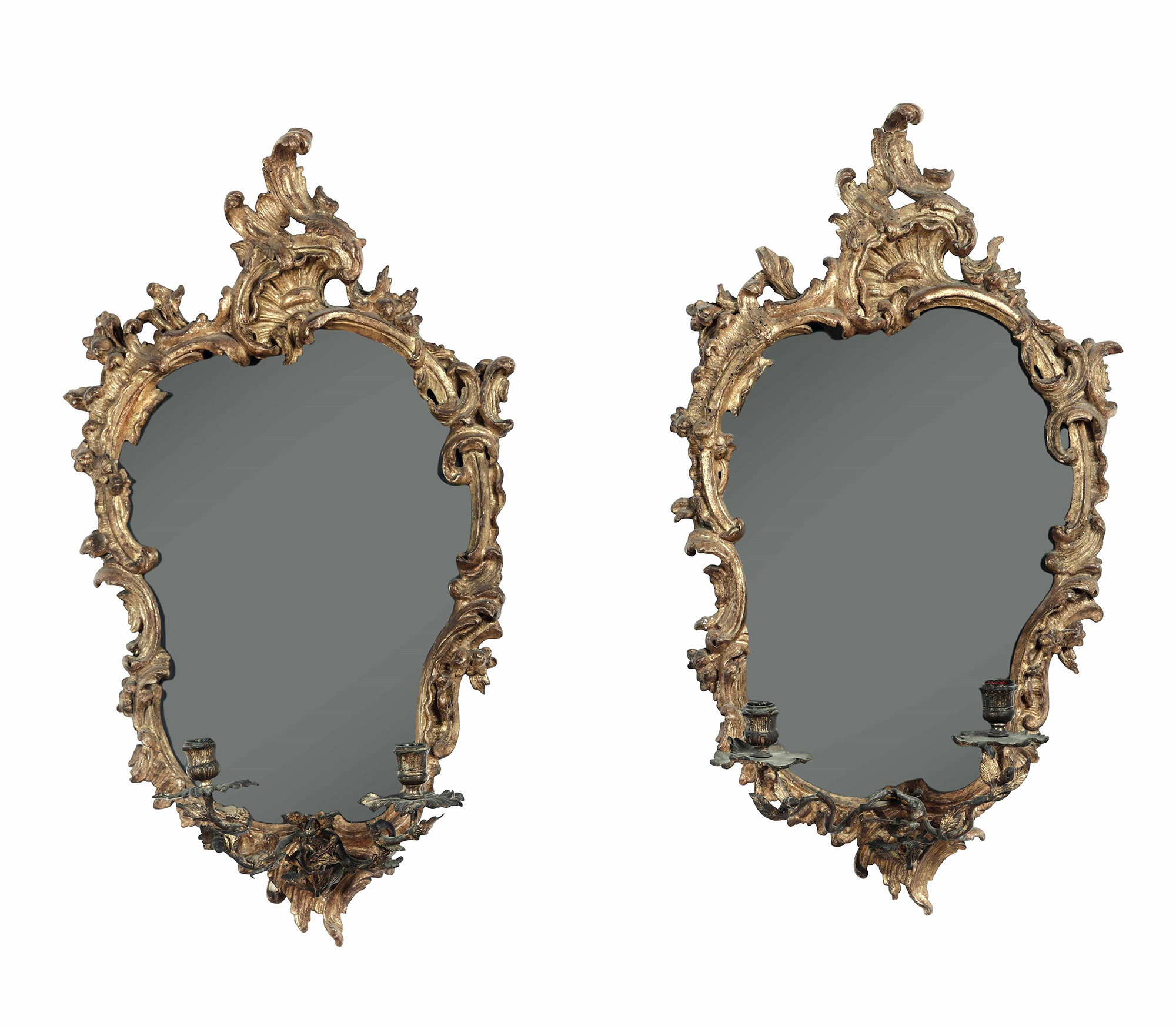 Coppia di specchiere in legno intagliato e dorato. Veneto, XIX-XX secolo, Di forma mossa, ornate da volute e foglie. Portacandela sagomati in bronzo, W. 40 - H. 71 cm
