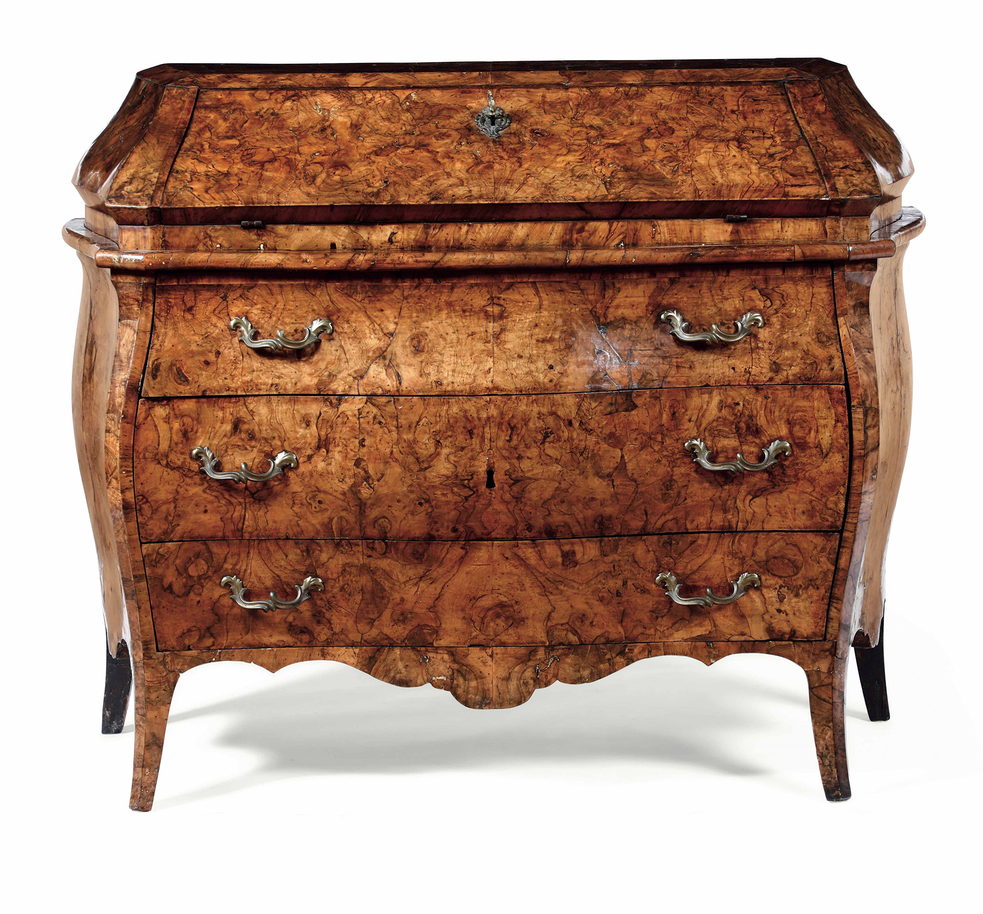 Ribalta ad urna in radica di noce. Ebanisteria lombarda o emiliana, XVIII secolo, fronte e fianchi mossi, tre cassetti con maniglie in bronzo, grembiule curvilineo, W. 135 - D. 62 - H. 108 Cm