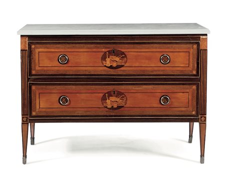 Coppia di comò Luigi XVI intarsiati, Napoli XVIII secolo, fronte e fianchi dritti, due cassetti centrati da panoplie musicali intarsiate, piani in marmo bianco, W. 135 - D. 65 - H. 95 Cm