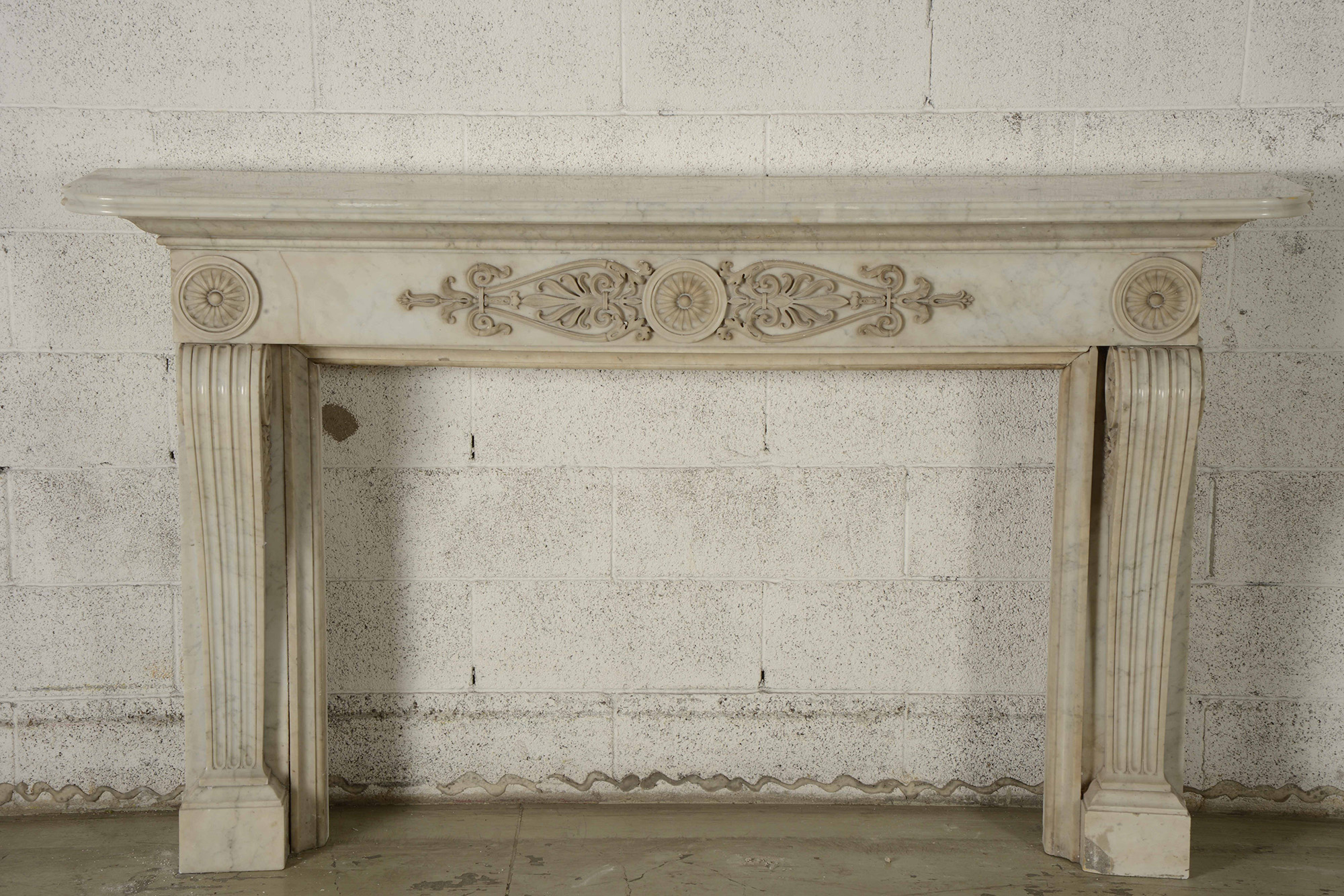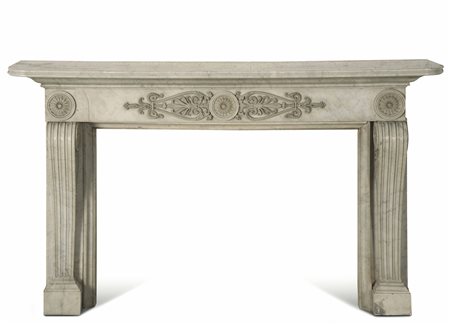 Camino Carlo X in marmo, XIX secolo, Fascia con rosone centrale e due alle estremità, montanti scanalati scolpiti a ricciolo, W. 187 - D. 41 - H. 110 cm