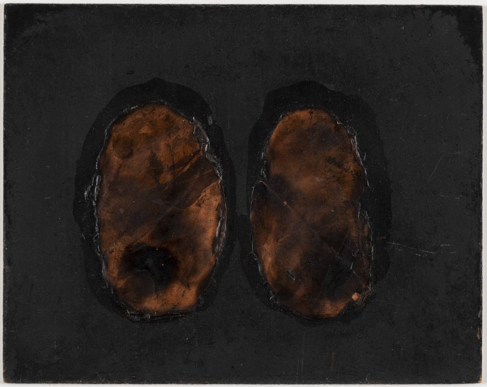 Collage di carta bruciata su tavola dipinta, cm. 19,5 x 25