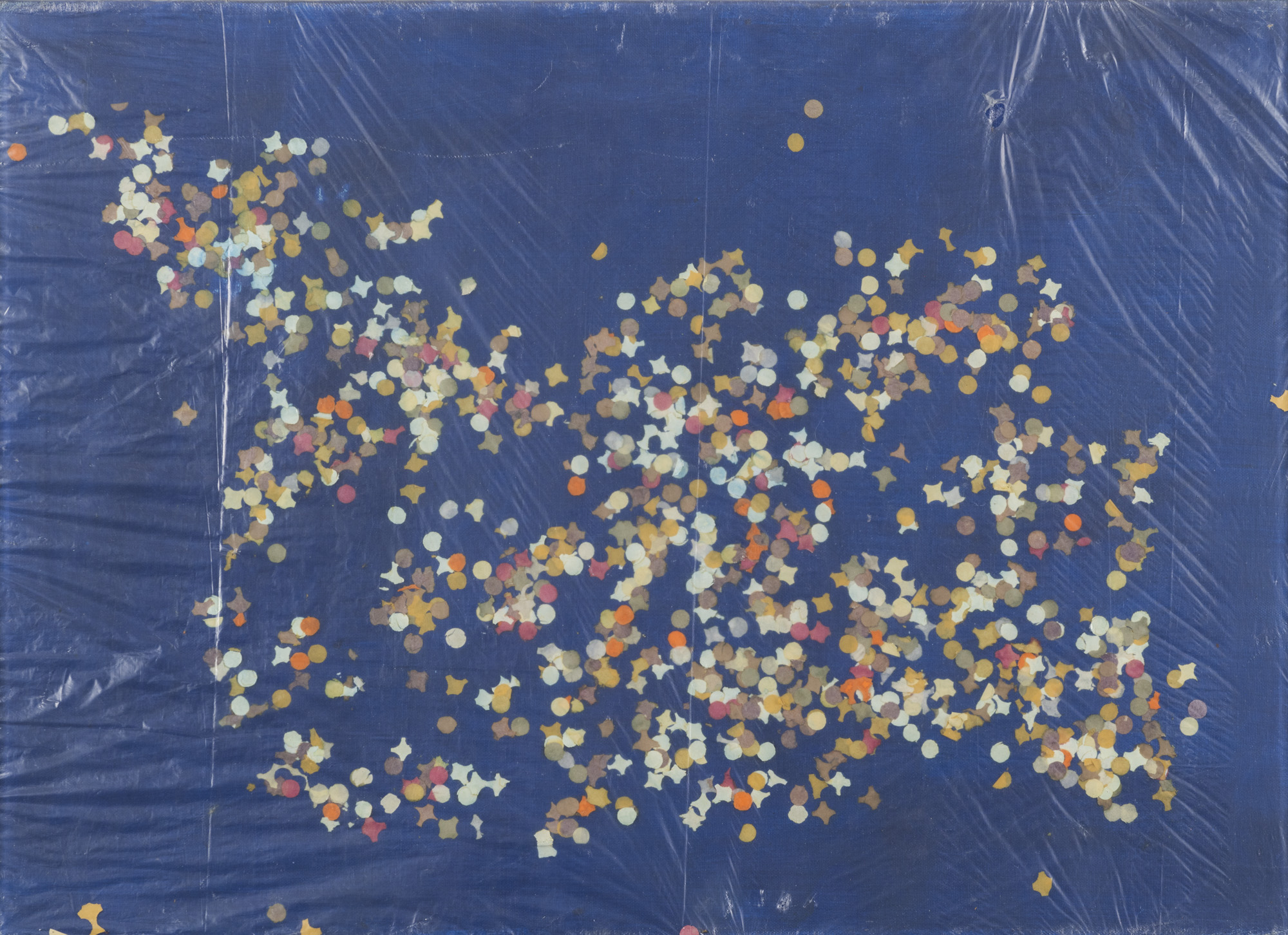 Acrilico, coriandoli e plastica su tela, cm. 70 x 50