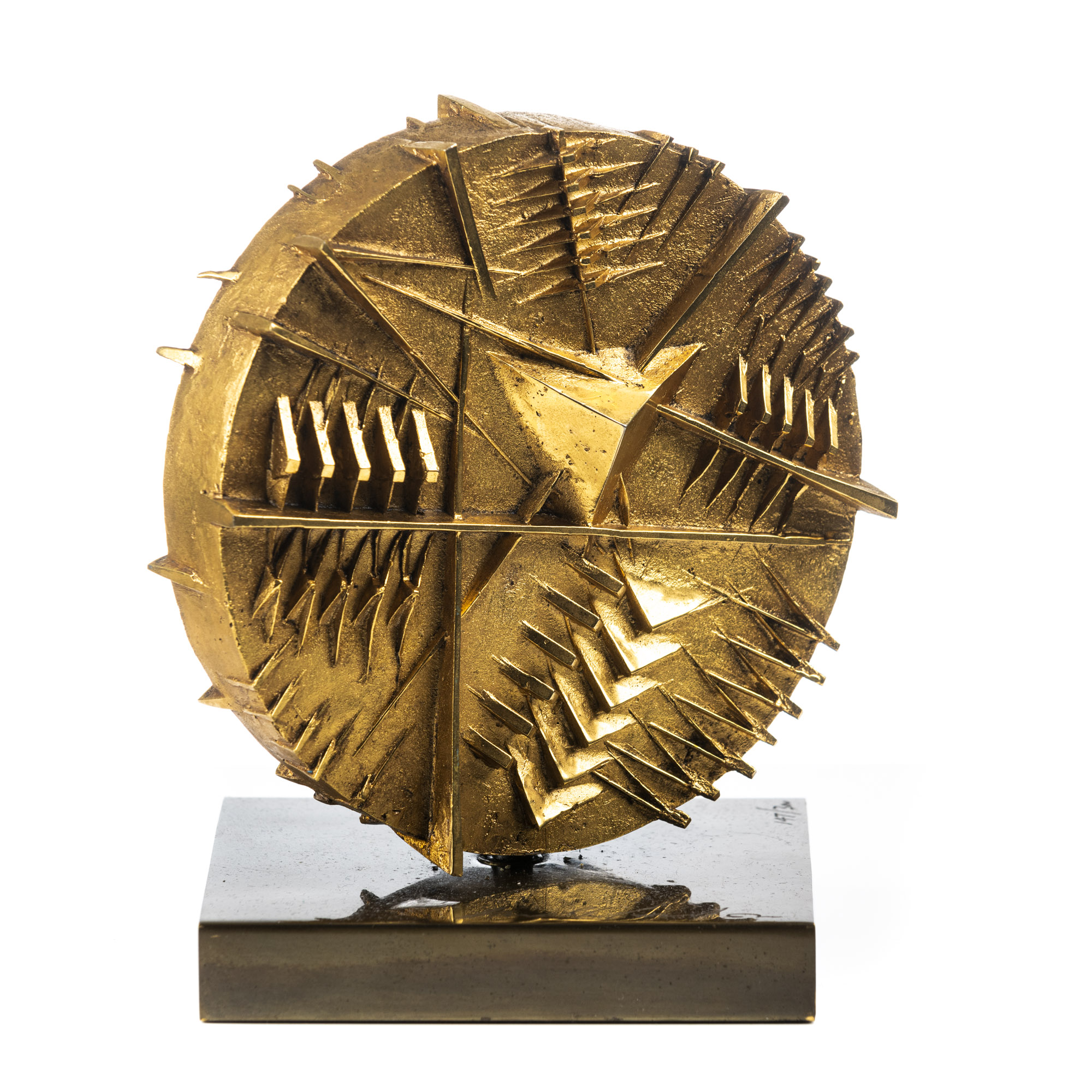 Multiplo, scultura in bronzo dorato, diametro cm. 15, con base in ottone, h cm. 17