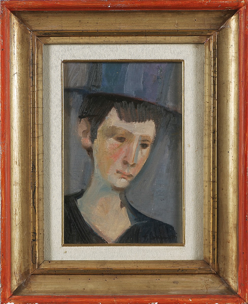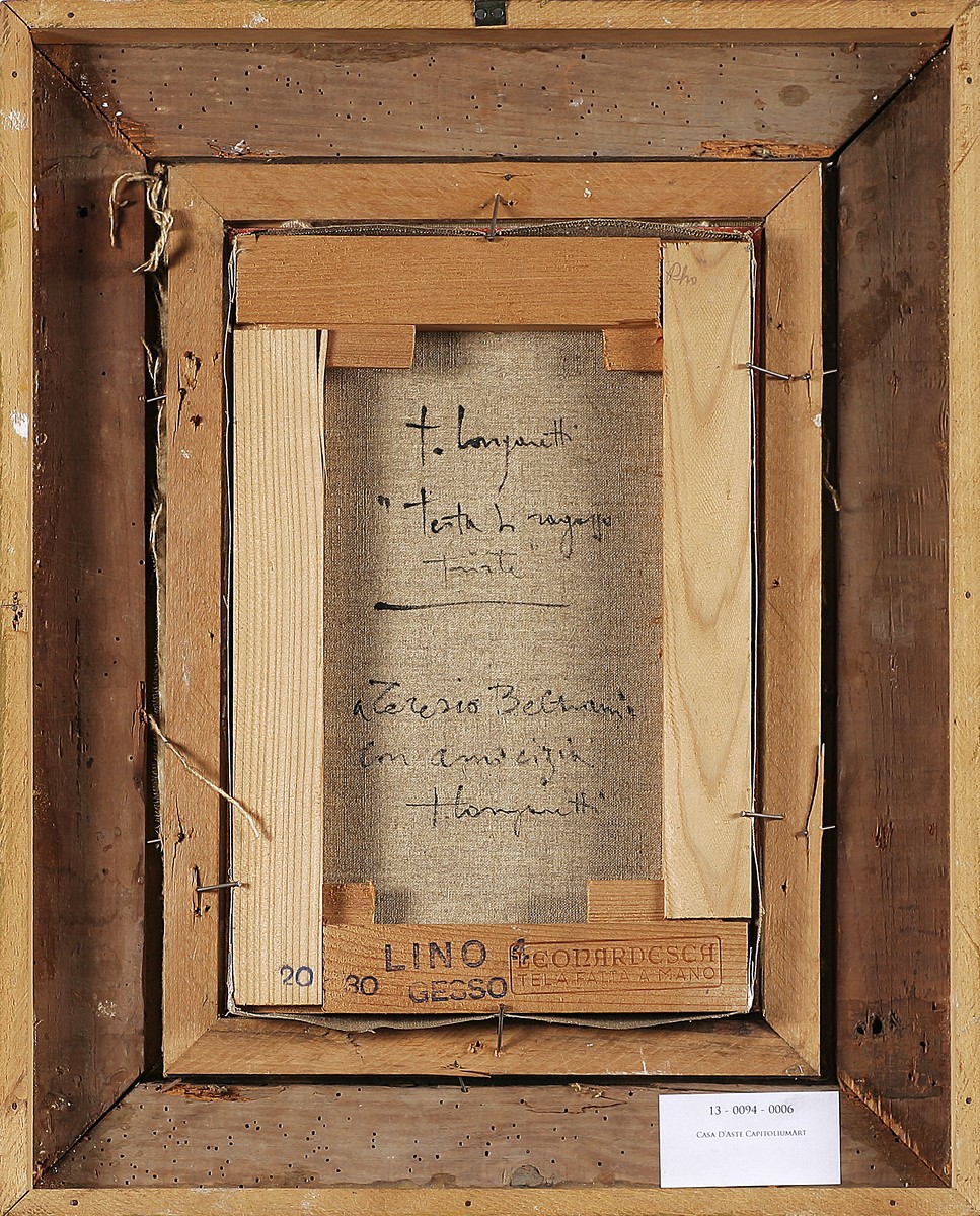 LONGARETTI TRENTO (n. 1916) Testa di ragazzo triste. Olio su tela . Cm 30,00 x 20,00. Al retro firma, titolo e dedica. Opera archiviata presso l'inventario delle opere a olio di Trento Longaretti a cura dell' Associazione Longaretti, Bergamo, come da documentazione fotografica allegata riportante numero d'archivio. . Cornice presente