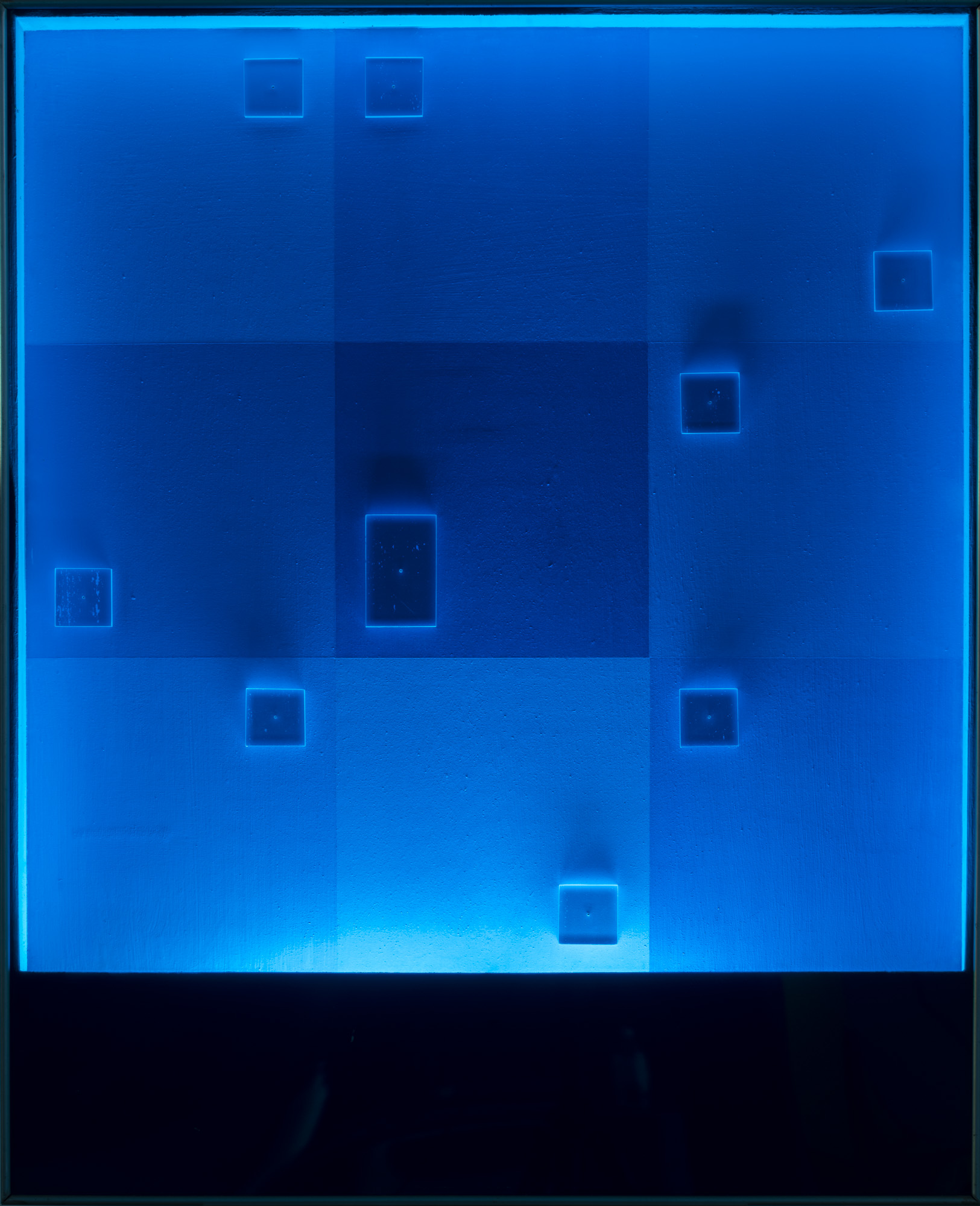 Box, plexiglas, legno, neon, sistema elettrico, cm. 77 x 63