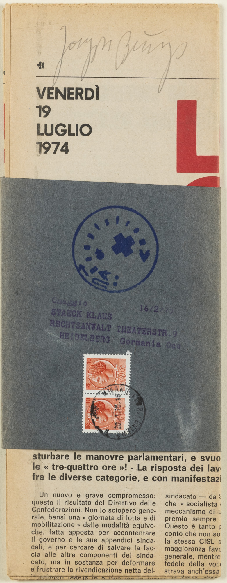 Multiplo oggetto, giornale piegato con busta affrancata, cm. 29 x 11