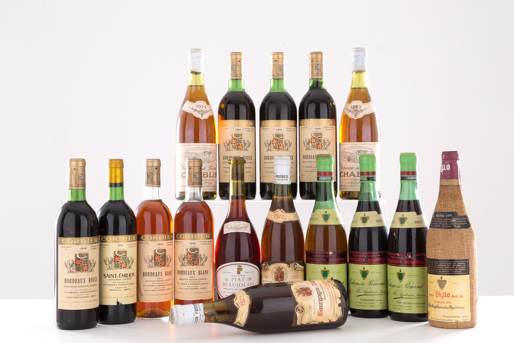 Selezione Francia e Spagna. - Bordeaux Cordier Rouge 1970 (4 bt) - Bordeaux Cordier Blanc 1970 (2 bt) - Cordier Saint-Emilion 1975 (1 bt) - Chablis Domaine de Bieville 1975 (2 bt) - Bodegas del Romeral 1971 (3 bt) - Vino Siglo Rioja (1971) (1 bt) - Bourgogne Aligote Dufouleur Fréres 1972 (2 bt) - Le Piat de Beaujolais 1976 (1 bt)
