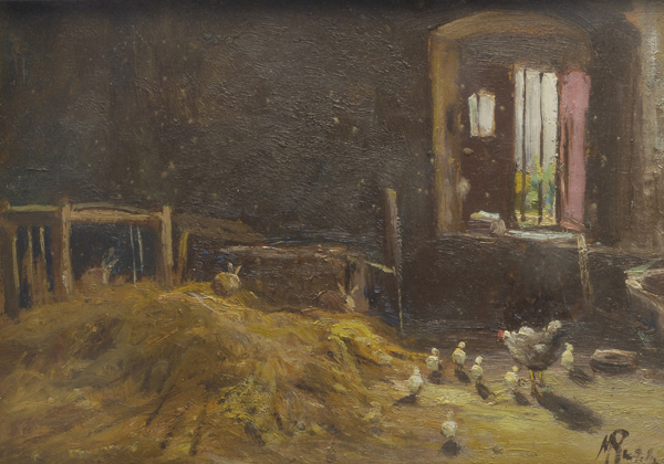 Rutilio Muti (Vicchio di Mugello, 1904 - 1995) CHIOCCIA CON PULCINI Olio su tavola, cm. 24x33,5 Firma in basso a destra.